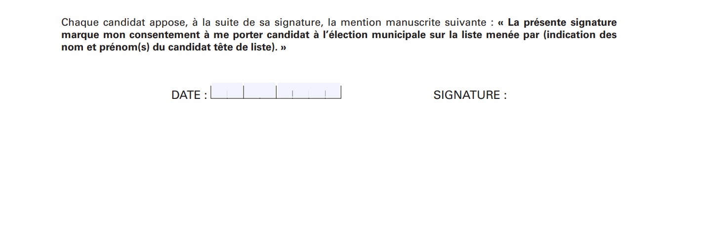 « La présente signature marque mon consentement à me porter candidat à l’élection municipale menée par Antoine CURATOLO.«