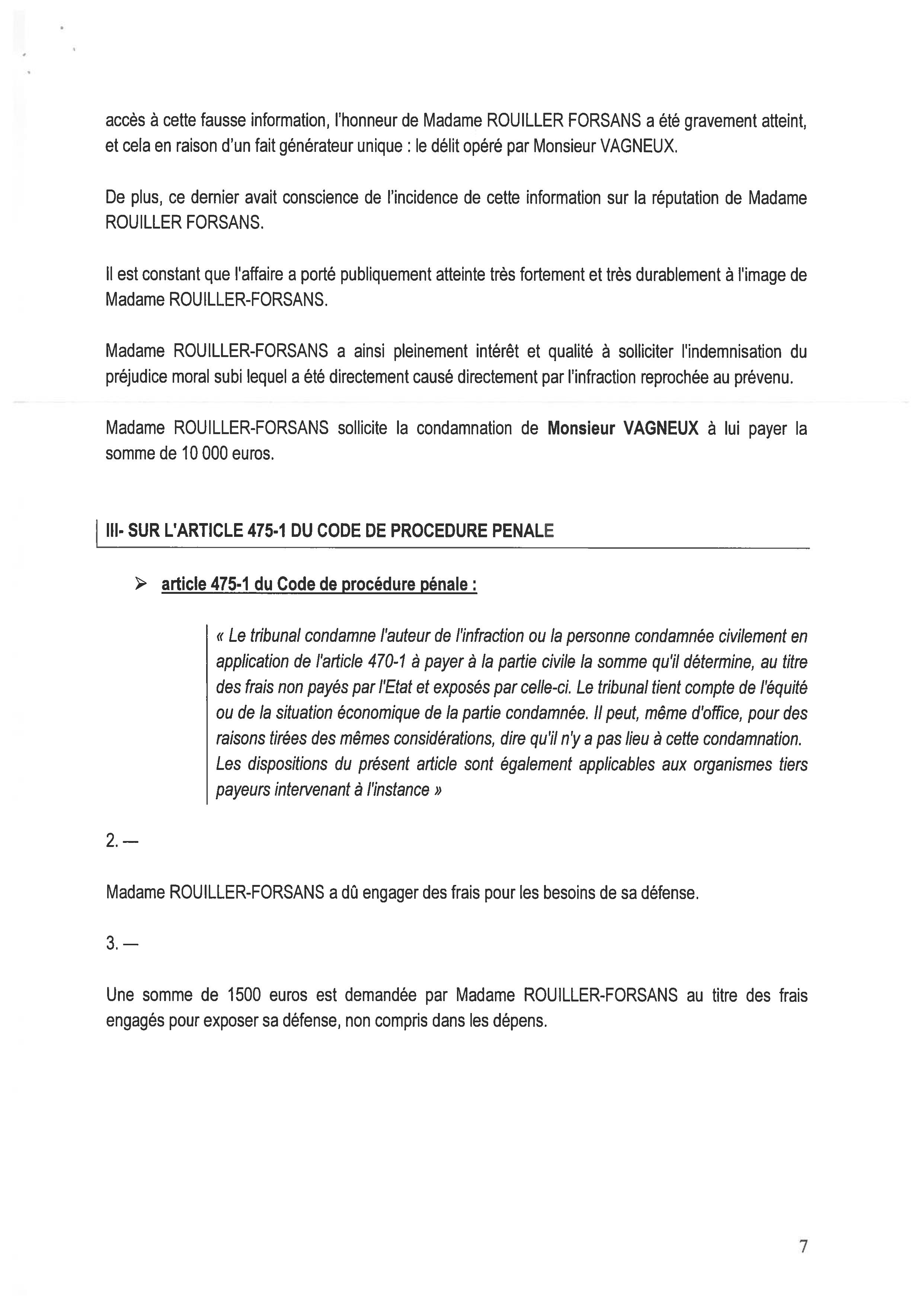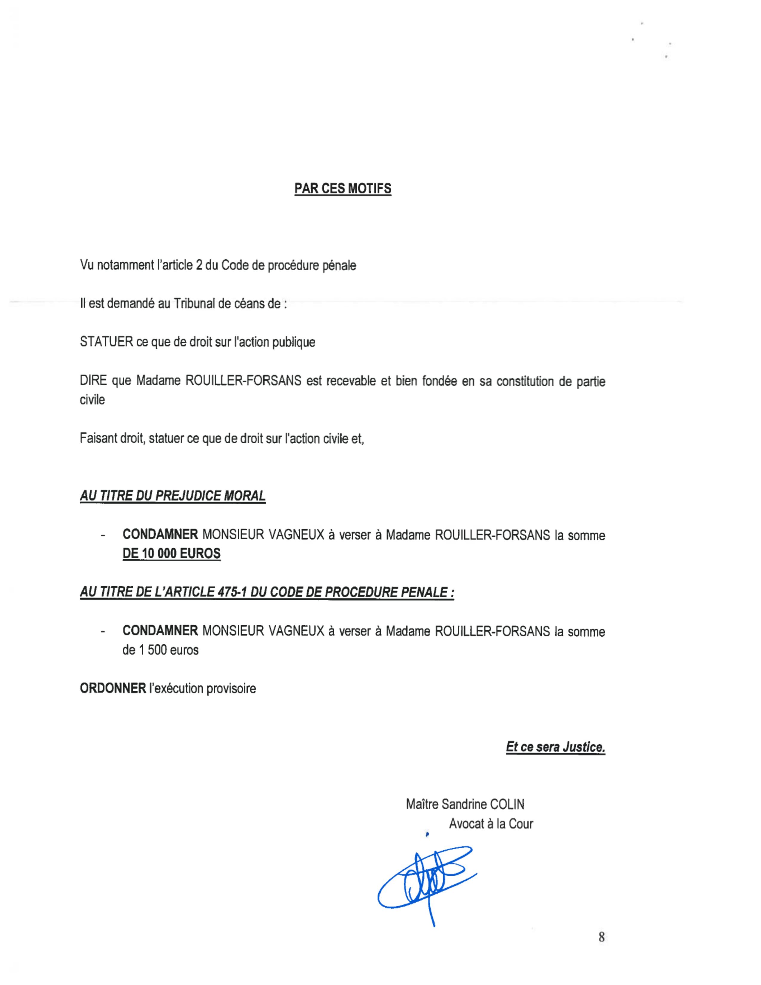 Il y a encore quelque chose que j’ai remarqué : moins l’avocat est assuré de ce qu’il raconte et plus l’amende qu’il demande est importante. Avec 10 000 euros de dommages-intérêts et 1 500 euros de frais de Justice, on atteint effectivement des sommets de doute…