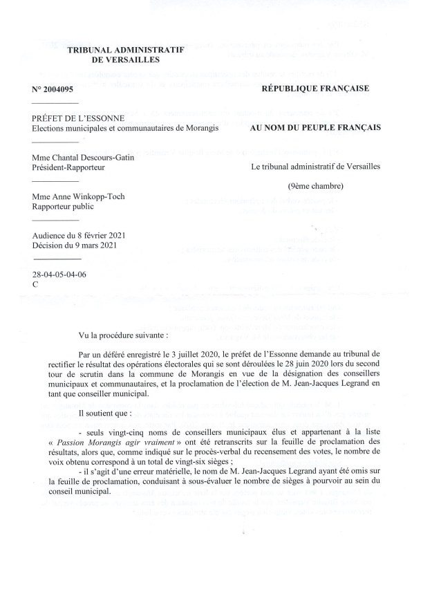 Le préfet de l’Essonne contestait l’élection municipale de Morangis pour une erreur matérielle mineure (un nom oublié sur le procès-verbal de proclamation des résultats).