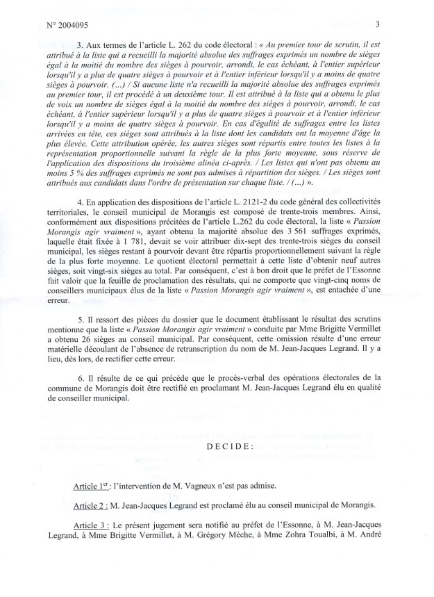 L’expérience aura été intéressante en tant qu’il s’agissait de mon premier mémoire en intervention. Mais le plus amusant est la réaction de la Commune de Morangis, avec un conflit d’intérêt énorme, parce que l’argent des Morangissois n’a pas à servir à défendre l’élection de Brigitte VERMILLET, qui constitue avocat cinq jours après mon intervention…