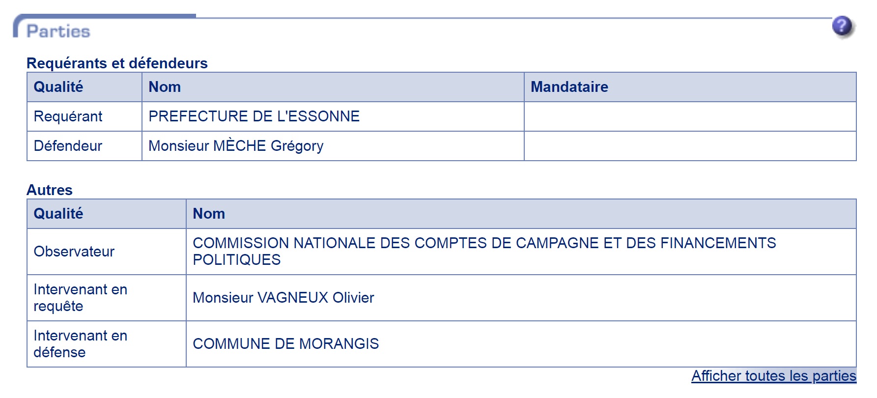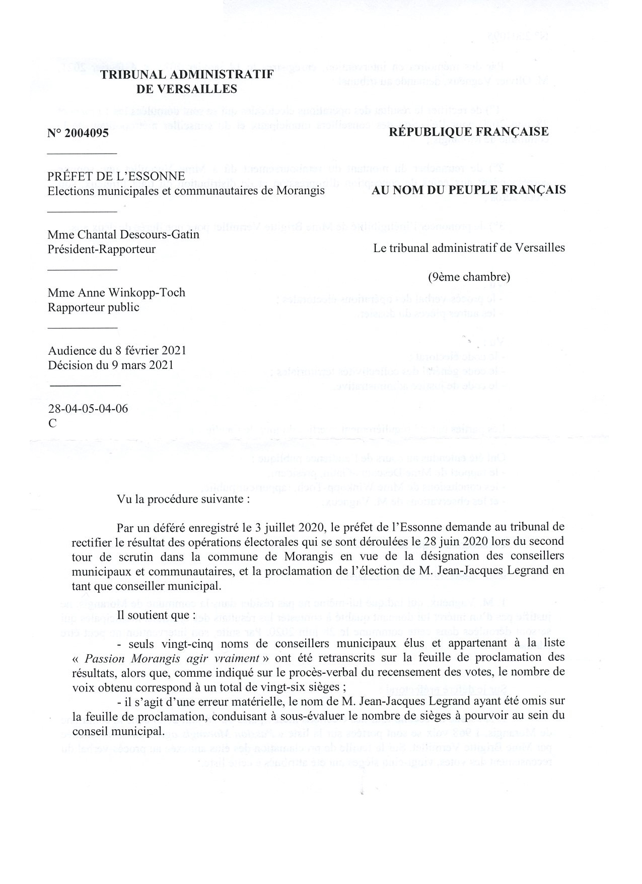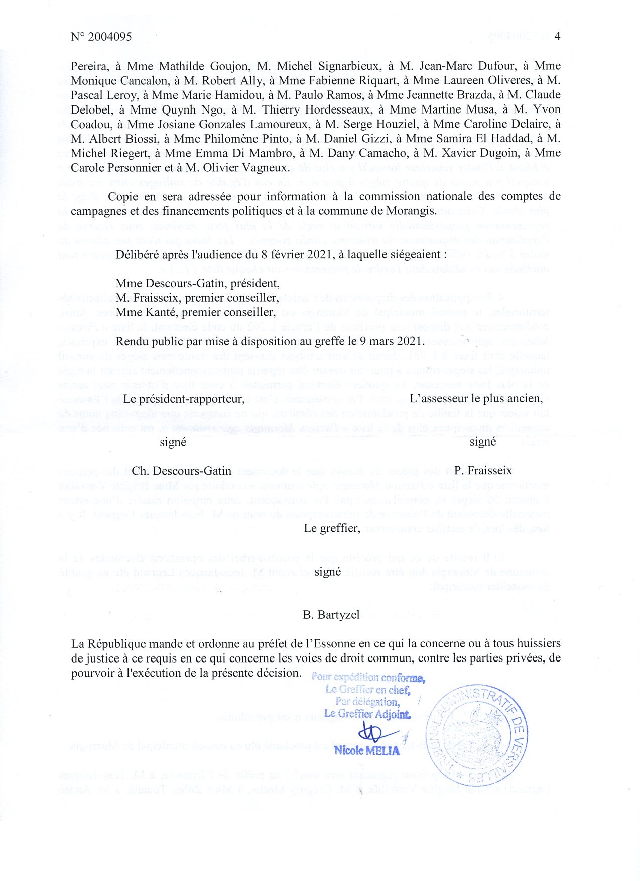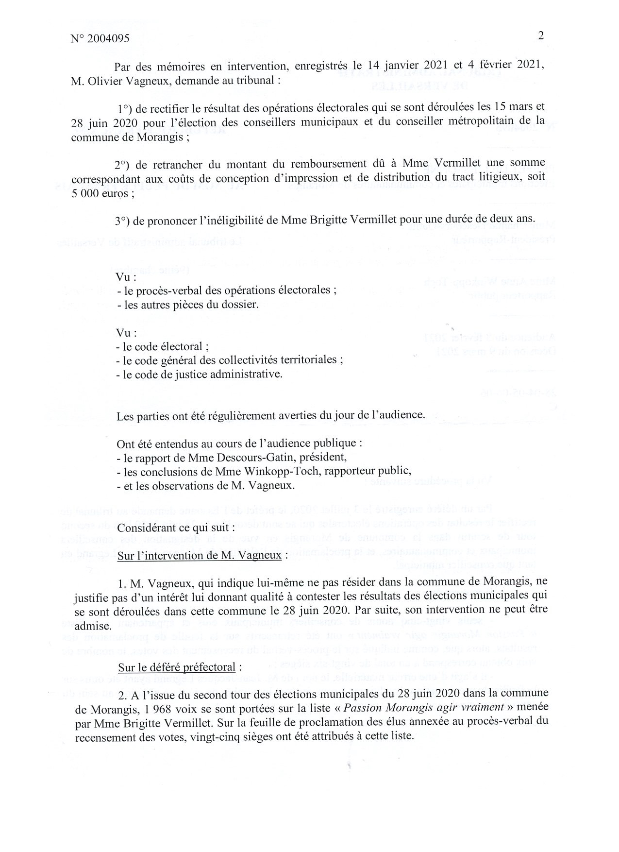 L’expérience aura été intéressante en tant qu’il s’agissait de mon premier mémoire en intervention. Mais le plus amusant est la réaction de la Commune de Morangis, avec un conflit d’intérêt énorme, parce que l’argent des Morangissois n’a pas à servir à défendre l’élection de Brigitte VERMILLET, qui constitue avocat cinq jours après mon intervention…