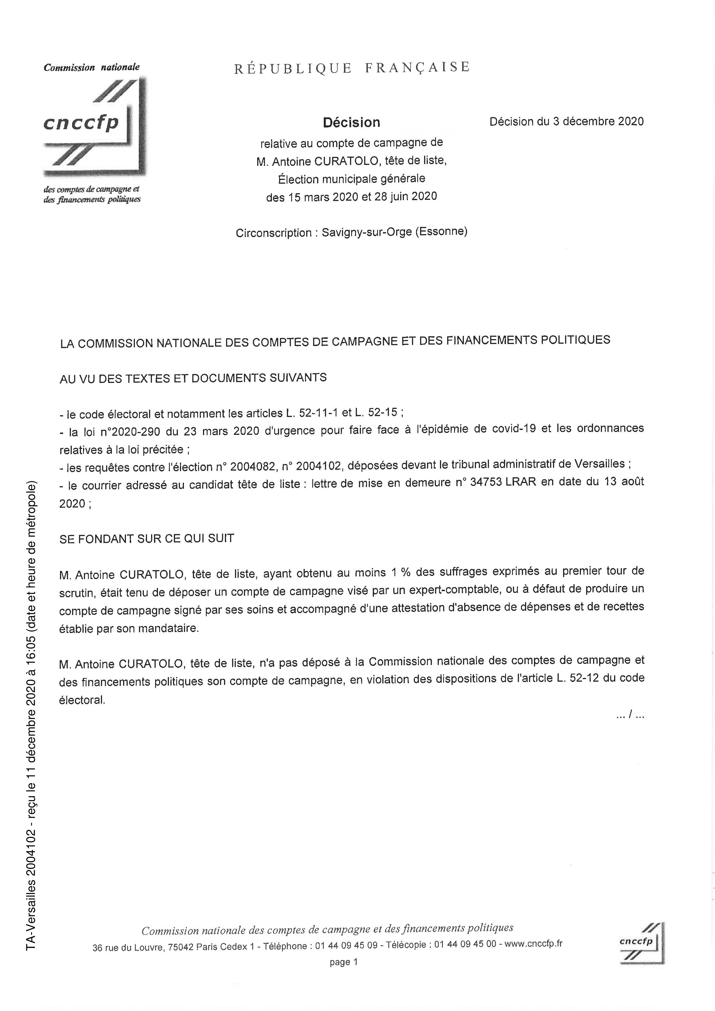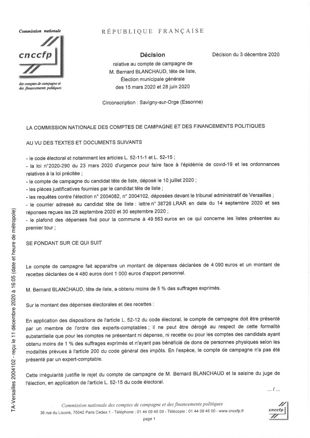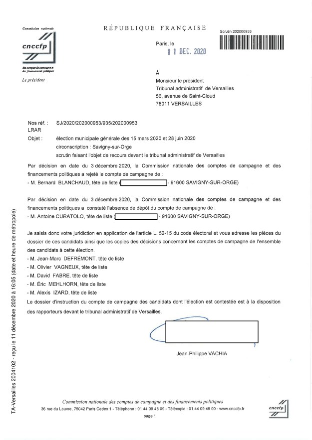 En effet, les jugements nos 2008394 et 2008396 du 16 février 2021 du Tribunal administratif de Versailles sont tous les deux entachés d’une erreur de droit tirée de la tardiveté et donc de l’irrecevabilité de la saisine du Tribunal administratif par la Commission des comptes de campagne et des financements politiques (CNCCFP) !!!