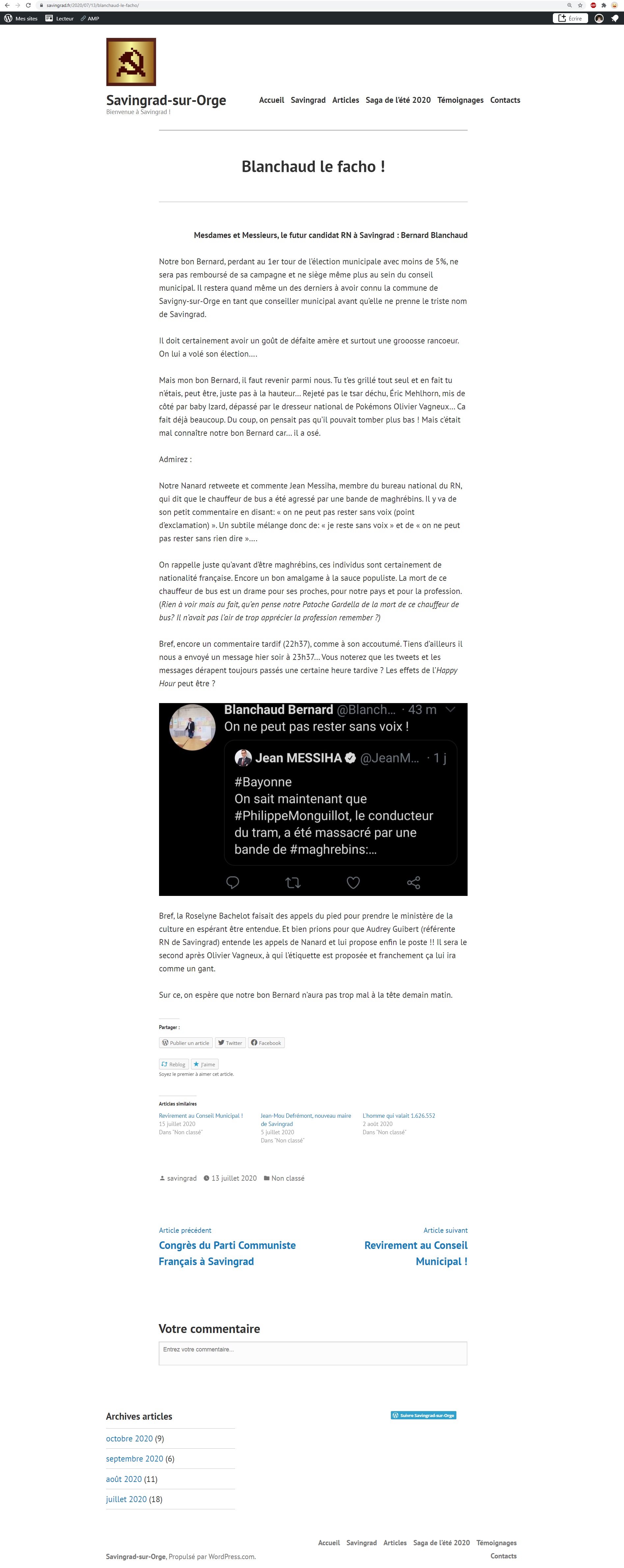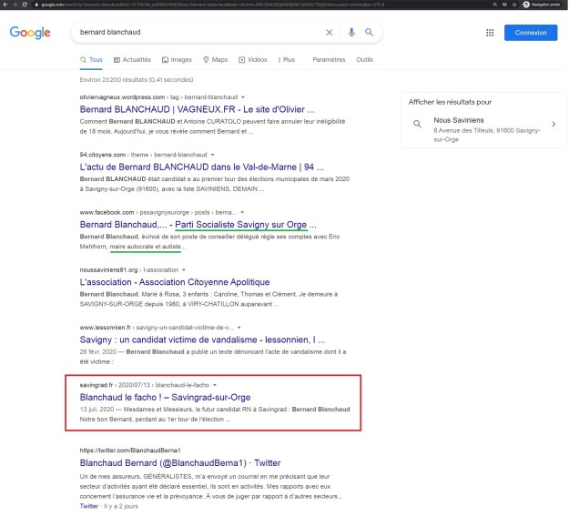 Bernard, visiblement masochiste, parce qu’il discute au calme avec celui qui l’a bien traité de « facho » devant internet tout entier… Sur le site de Savingrad. Ce qui représente la 6e recherche Google, en première page, lorsque l’on recherche le nom de Bernard… Bon après, c’est quand même moins humiliant que la photo de sa voiture dégradée en 5e position avec écrit « Salop » et des sexes dessinés dessus…