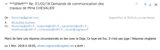 - d’autre part, à me communiquer l’intégralité des productions de Catherine CHEVALIER ; cette conseillère municipale de Savigny devenue chargée de mission auprès du vice-président MEHLHORN, maire de Savigny, que je soupçonne d’avoir fait l’objet d’une embauche de complaisance, pour ne pas écrire d’un emploi fictif.
