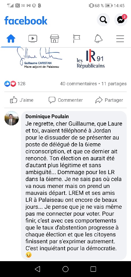 En effet, vendredi 9 avril 2021, un militant LR, soutien de Jordan HOUËT, annonce qu’il ne se connectera pas pour voter pour le seul candidat au poste de délégué de circonscription, du fait des pressions qui ont été exercées sur son candidat (pour lequel j’avais de très bons échos).