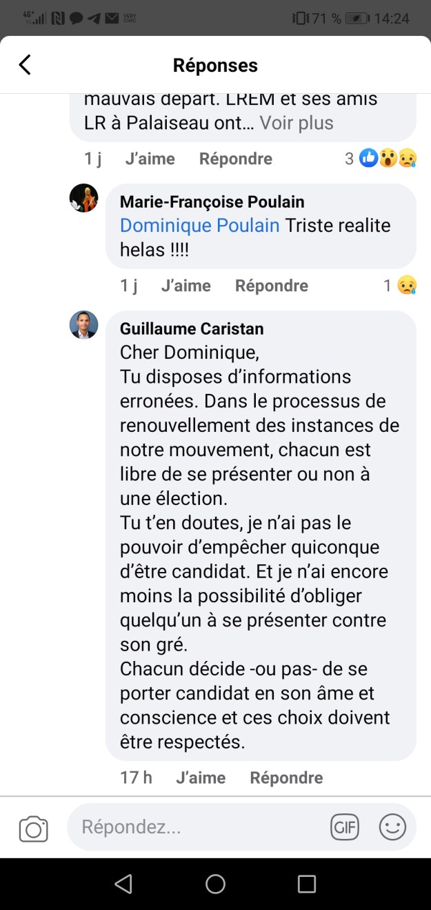 Et le lendemain, CARISTAN qui lui répond par des banalités ; comme s’il ne savait pas que Laure DARCOS avait fait comprendre à Jordan HOUËT qu’il perdrait son poste de responsable des jeunes LR du département s’il candidatait… DARCOS dont on rappelle qu’elle a quitté LR un soir, comme REDA, pour rejoindre Libres! avant d’y revenir le le demain matin…