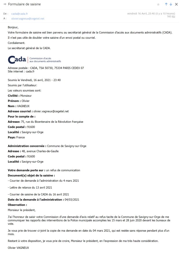 Le maire de Savigny-sur-Orge m’empêche d’accéder à des documents qui permettraient de faire annuler les élections municipales. J’en suis donc réduit à saisir la Commission d’accès aux documents administratifs (CADA). C’est donc qu’il n’est pas tranquille, sinon pourquoi me refuserait-il la communication de ces rapports ? En attendant, je trouve particulièrement minable d’enfreindre la loi pour essayer de préserver son élection…