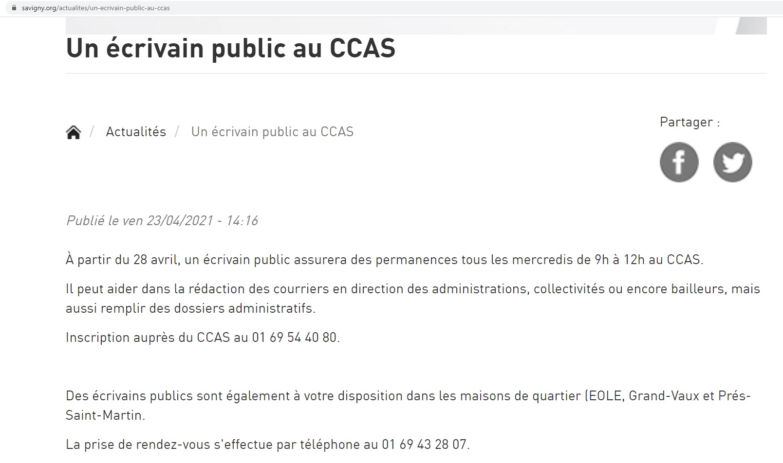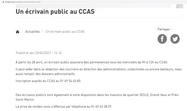 Cette semaine, j’ai reçu plusieurs messages, plus ou moins sur le ton de la blague, me demandant si j’étais devenu le nouvel écrivain public au CCAS de Savigny-sur-Orge. Eh non, ce n’est pas moi et je ne suis pas le seul écrivain public de Savigny.