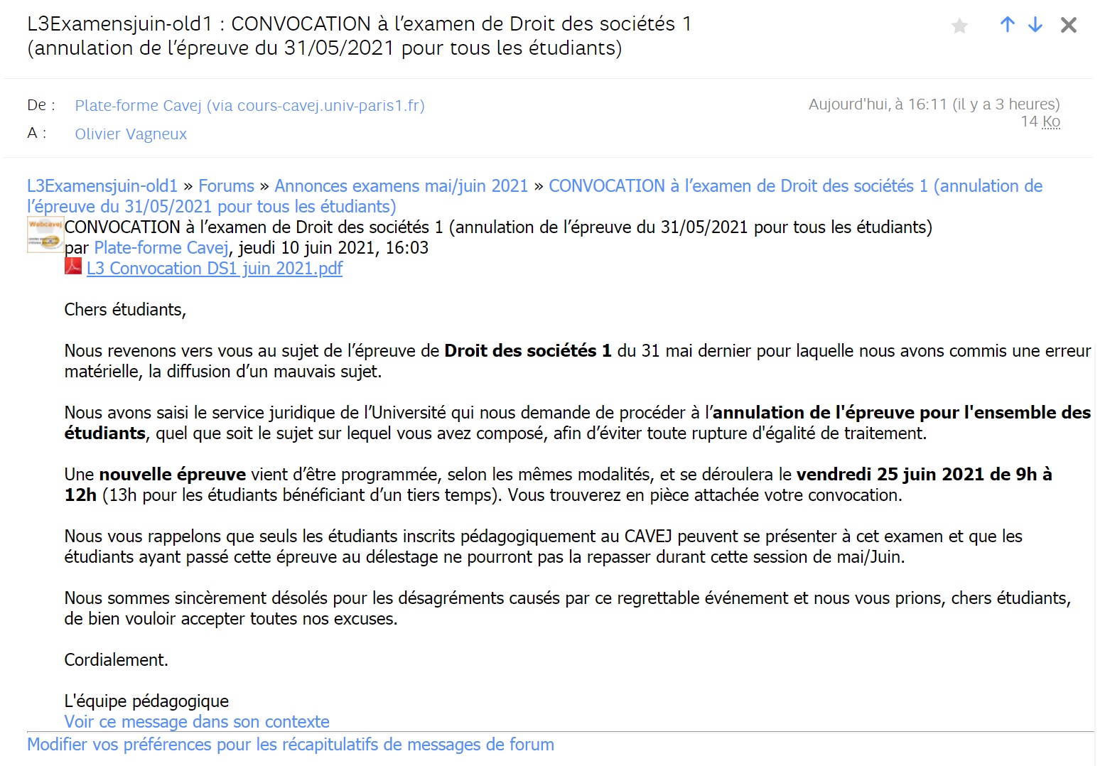 Bonne nouvelle pour moi, puisque l’épreuve de droit des sociétés, pour laquelle un mauvais sujet avait été proposé par l’université, est annulée pour tous les étudiants et qu’elle est reprogrammée le 25 juin 2021. Je n’irai donc peut être pas au rattrapage !
