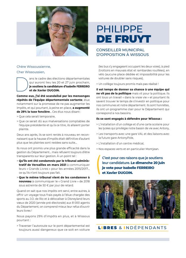 Le tract de mobilisation de Philippe DE FRUYT à Wissous
