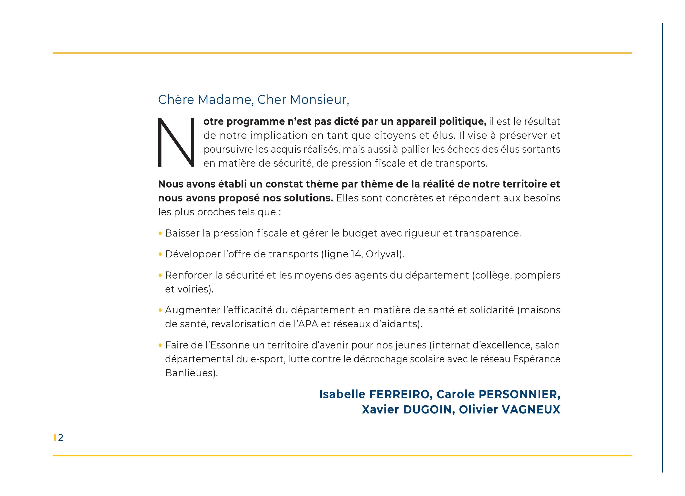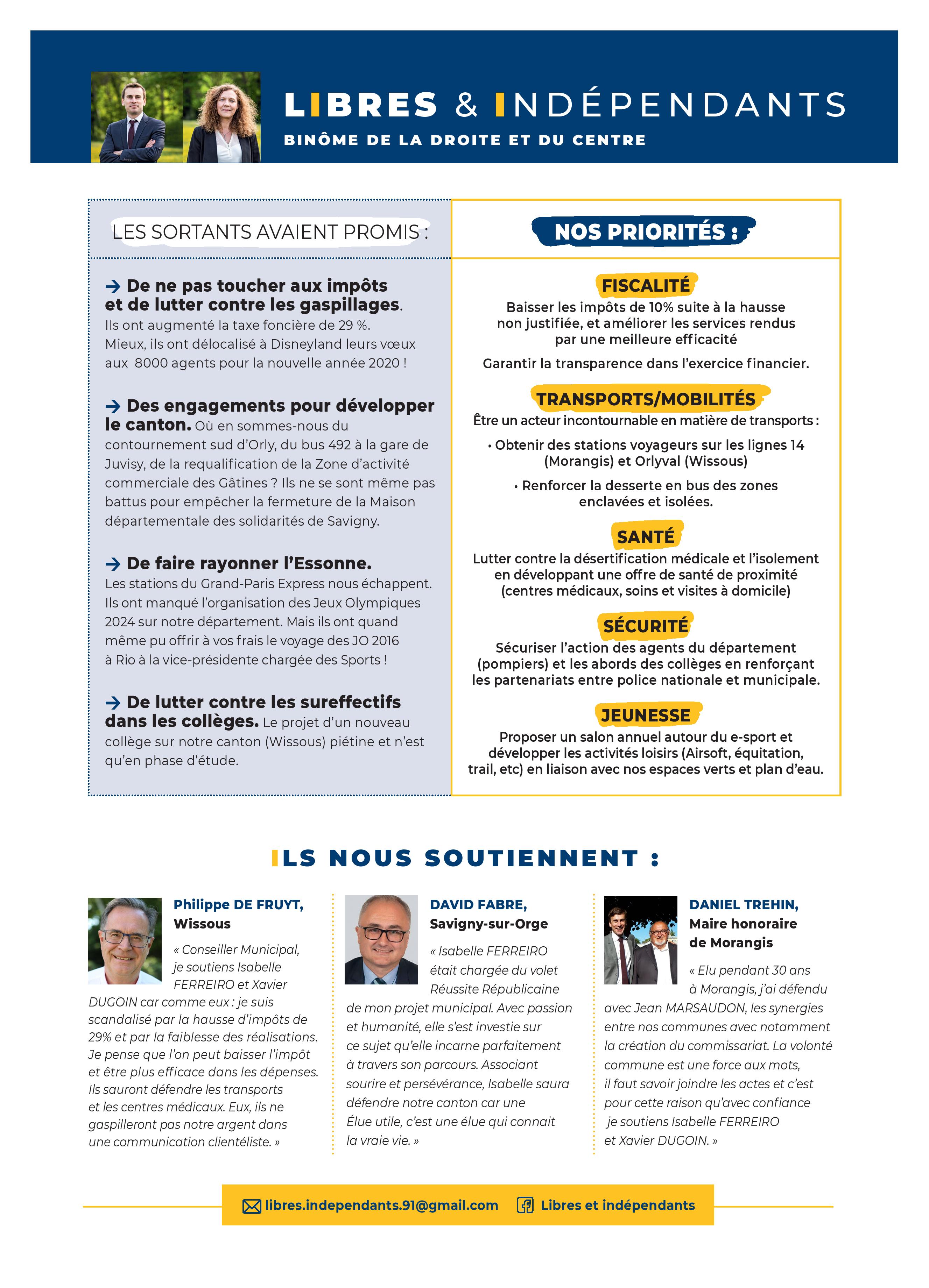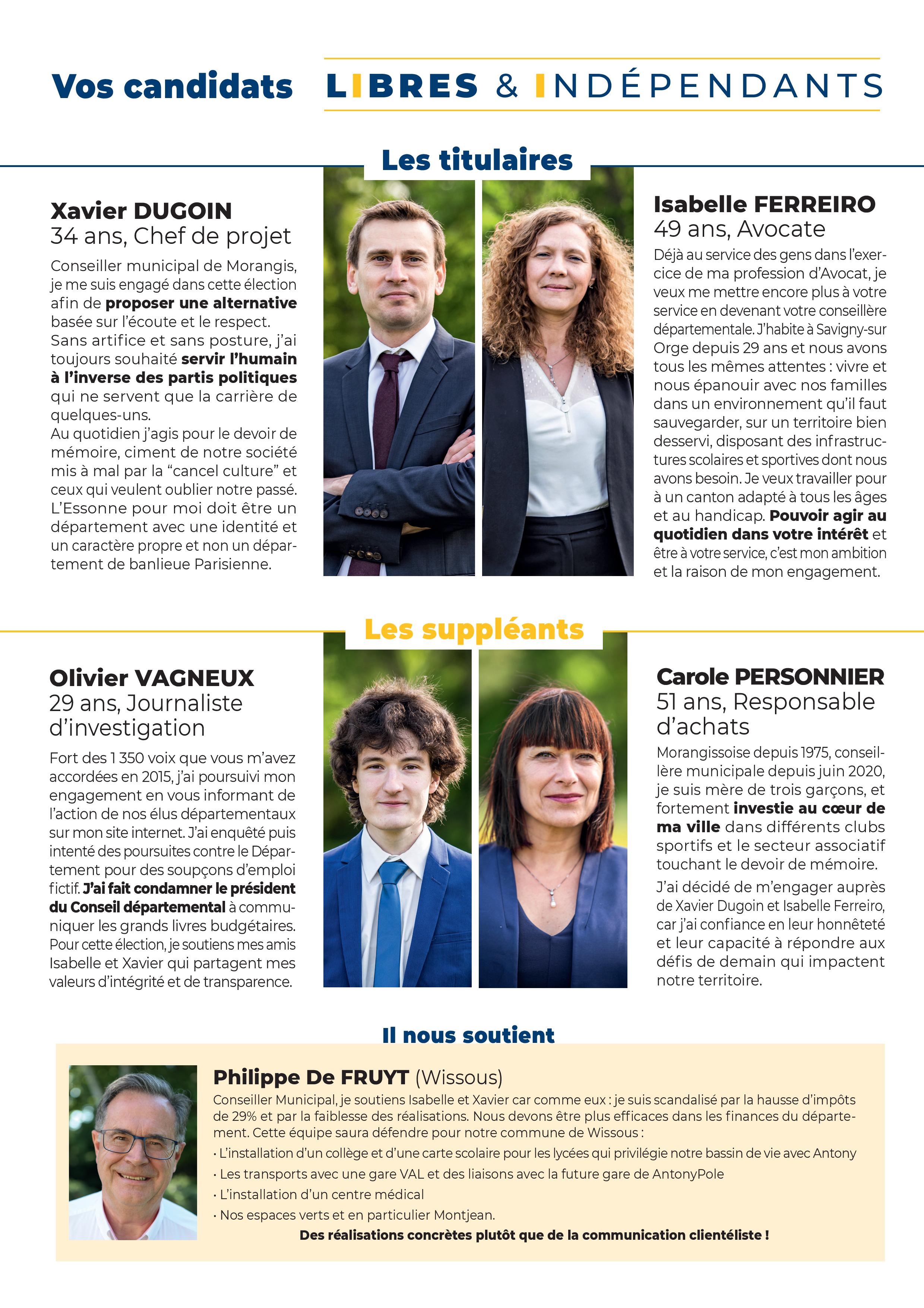 Binôme soutenu par Olivier VAGNEUX (Savigny), Carole PERSONNIER (Morangis), Philippe DE FRUYT (Wissous), Daniel TREHIN (ancien maire de Morangis) et David FABRE (Savigny).