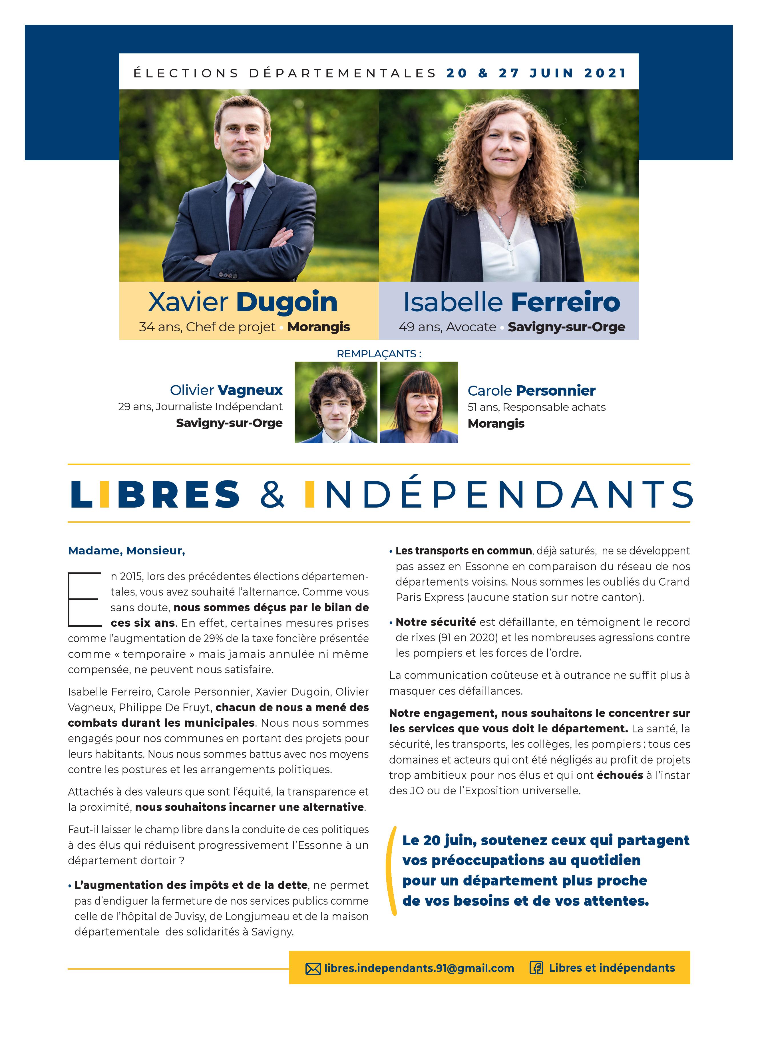 Je vote aux élections départementales pour le binôme « Libres et indépendants ».