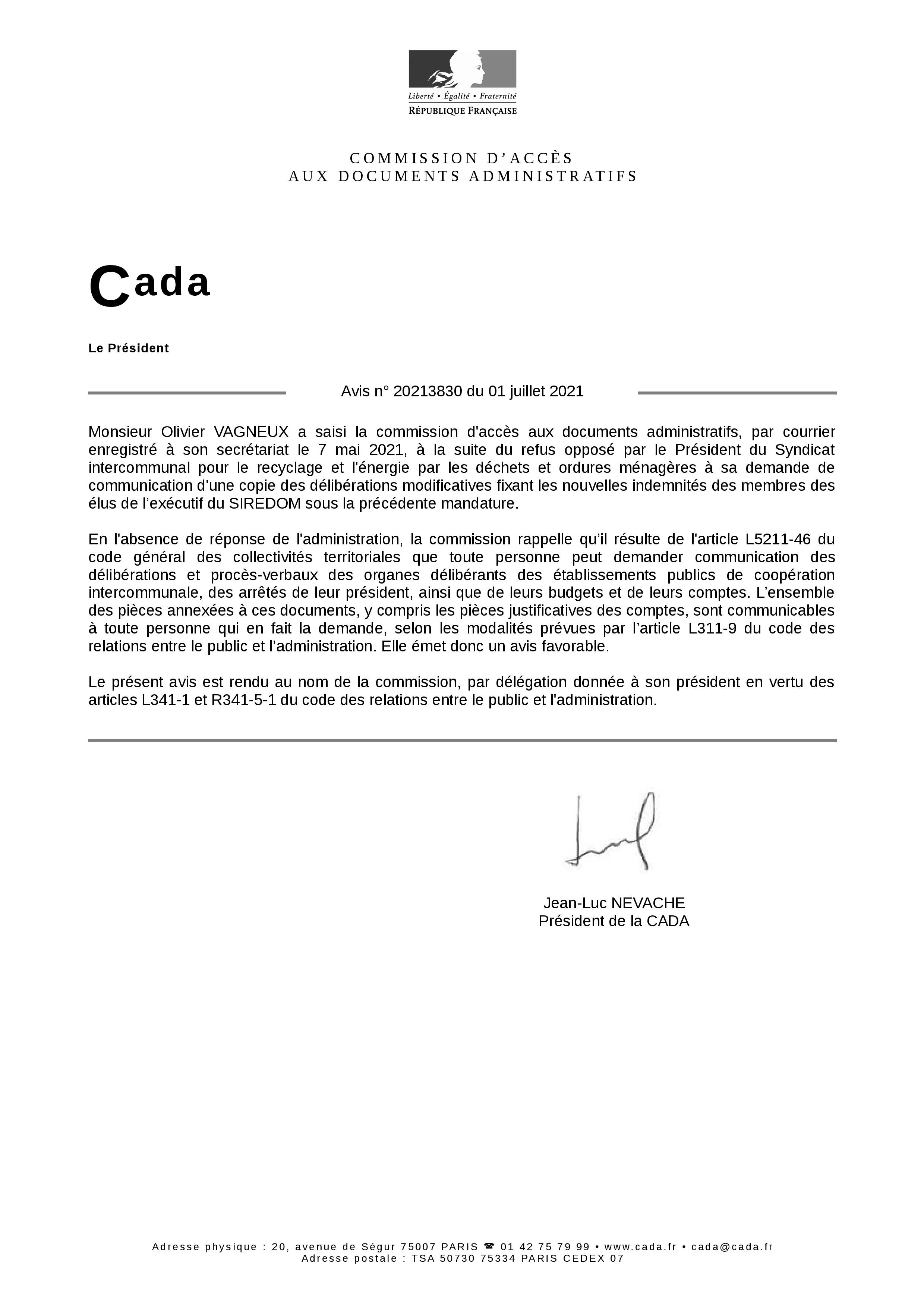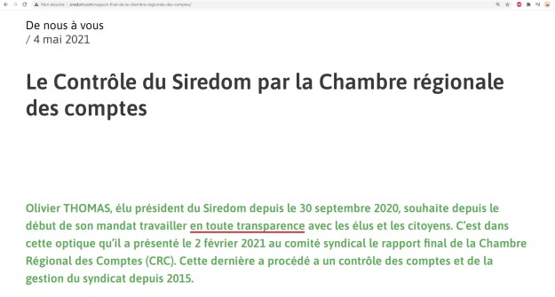Oui, mais voilà, au moment de vérifier la réalité des indemnités versées sous la présidence DUGOIN, pour la comparer à la présidence THOMAS, l’administration THOMAS m’a refusé la communication de ces documents, au demeurant difficilement trouvables car le site internet du SIREDOM ne comporte aucun index. J’ai donc dû saisir la Commission d’accès aux documents administratifs ; preuve qu’ils ne sont pas si transparents que cela envers les citoyens…