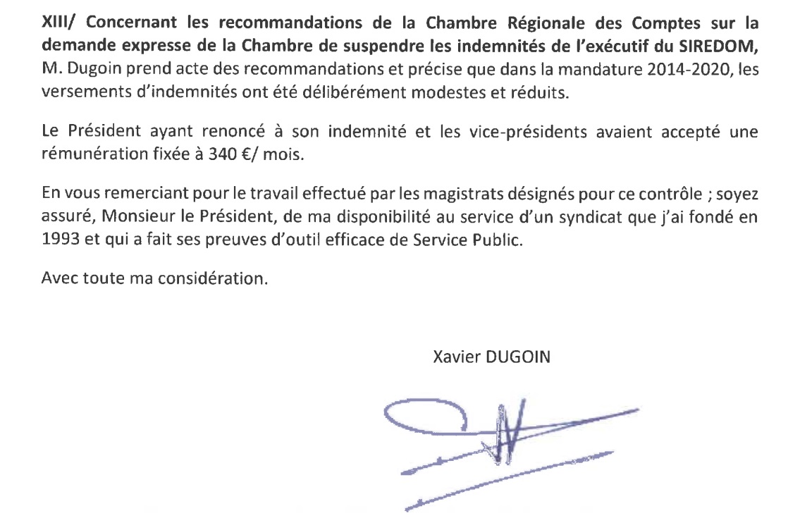 Invité à réagir sur le rapport de la CRC, Xavier DUGOIN soulève d’ailleurs dans sa réponse la question des indemnités de l’exécutif.