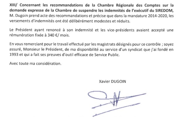En effet, alors que la Chambre régionale des comptes (CRC) a émis la recommandation de supprimer les indemnités de l’exécutif du syndicat, laquelle recommandation n’apparaît pas dans l’abstract publié sur le site internet de l’établissement public, nous avons découvert, non sans avoir dû saisir la Commission d’accès aux documents administratifs, que le montant global des indemnités s’élevait à 12 000 € brut mensuels contre 8000 sous la présidence DUGOIN.