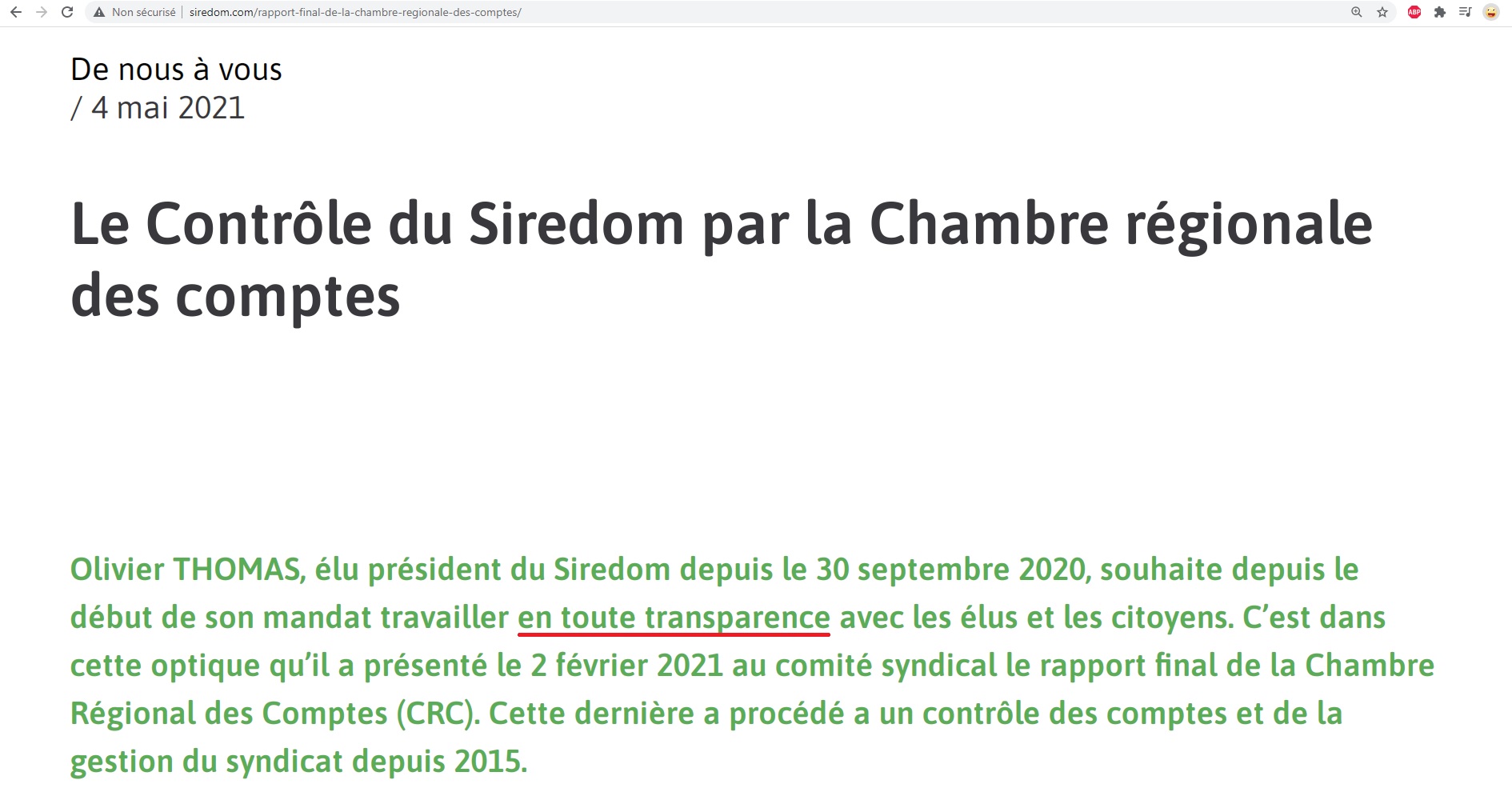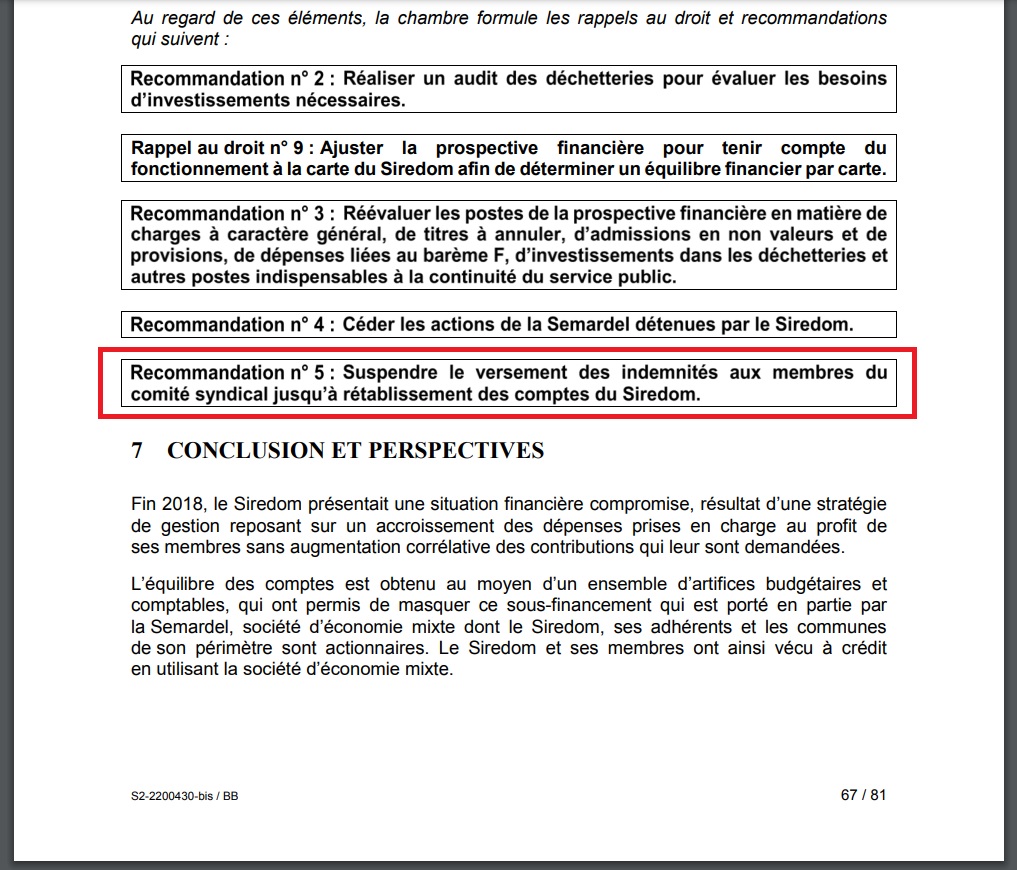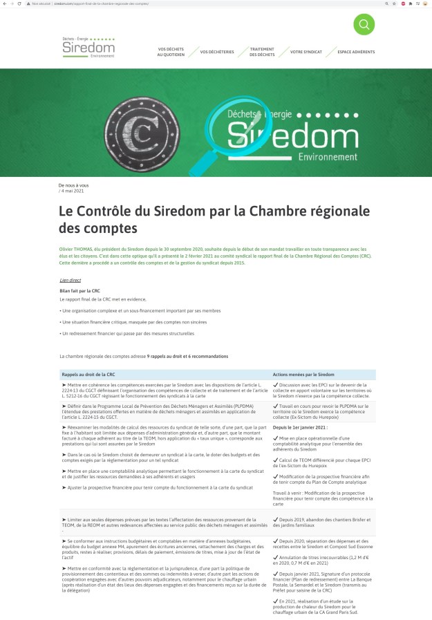 Sur le site internet du SIREDOM, on peut lire que la CRC a émis 9 rappels au droit et 6 recommandations, mais seulement et respectivement 6 et 3 sont explicitées.