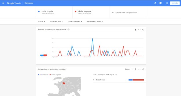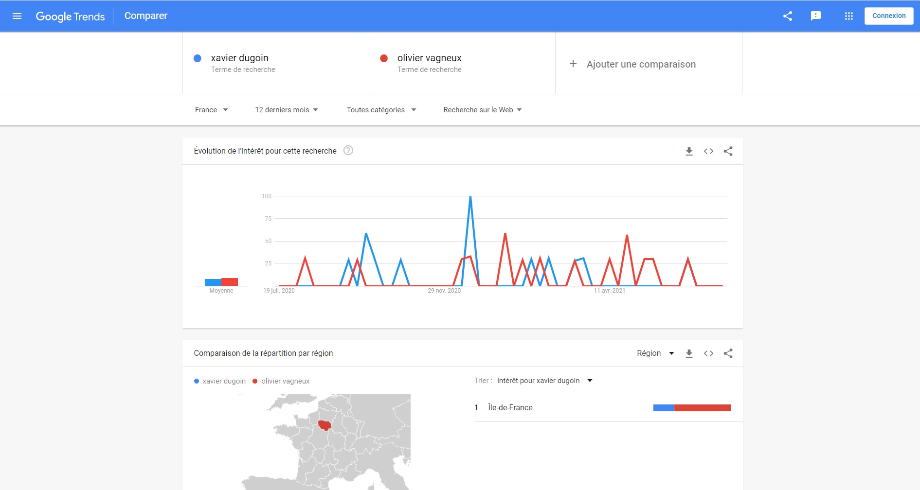 Parenthèse : malgré tous les efforts d’une presse essonnienne en mal d’audience pour nuire à l’ancien président du SIREDOM, les pics d’intérêt pour Xavier DUGOIN (je rappelle que deux personnes portent ce nom) demeurent somme toute assez limitées…