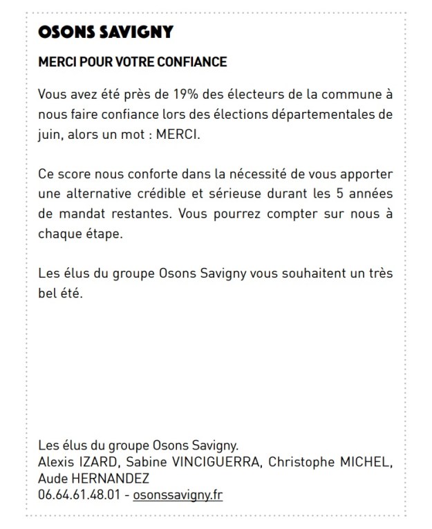 Comme la tribune du groupe d’Une ambition durable pour Savigny, ce sont des réflexions de politique de salon qui trahissent un entre-soi, et dont je ne suis pas persuadé qu’elles intéressent plus que leurs électeurs et qu’elles aient bien leur place dans un magazine municipal. Enfin, c’est toujours cela quand on a désespérément rien d’autre à écrire…