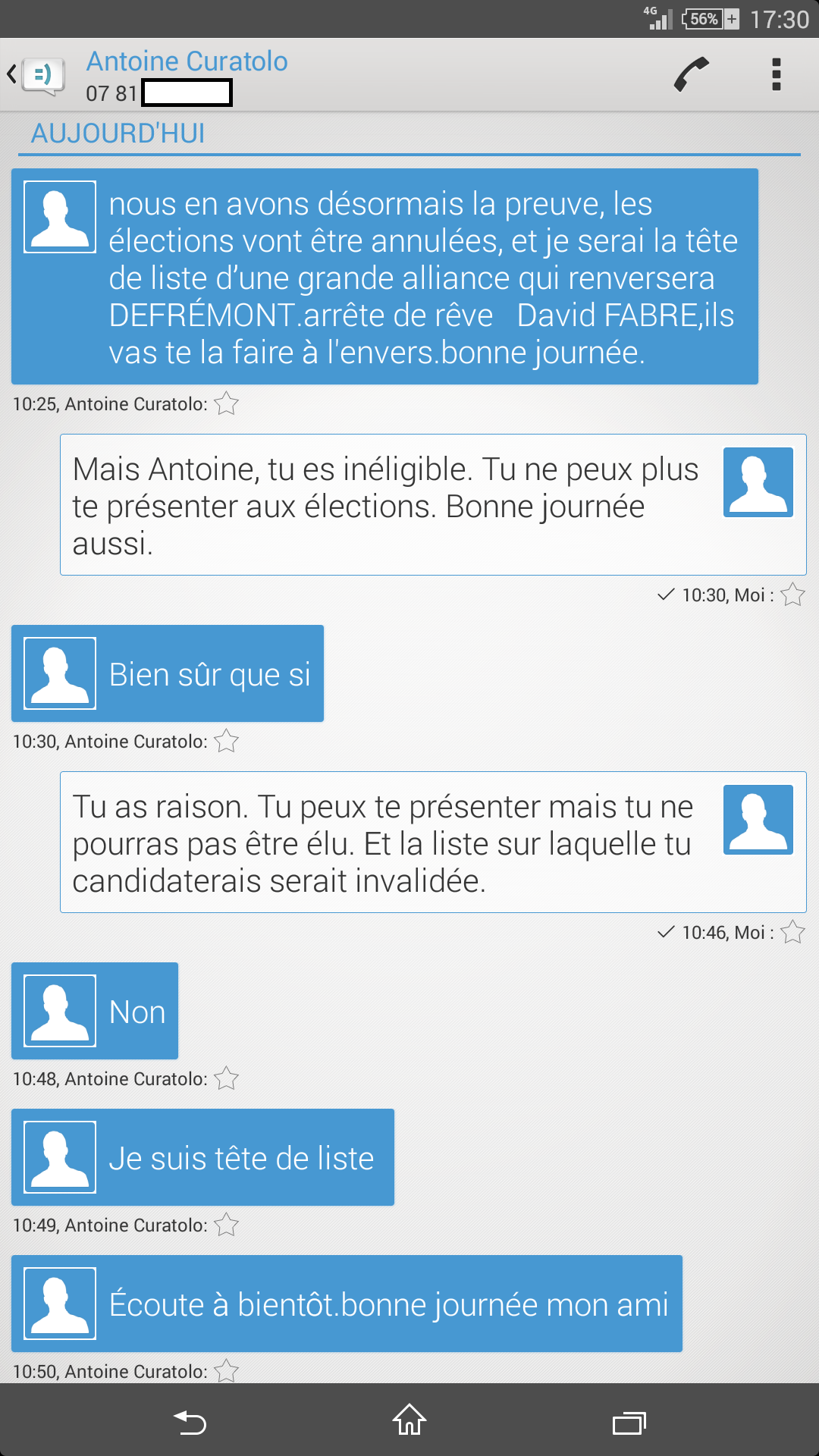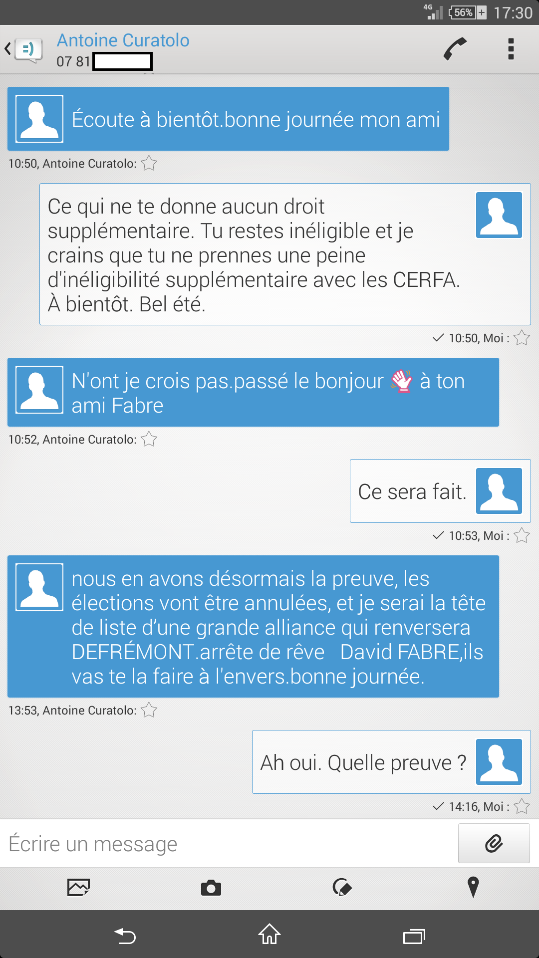 Entre 7 heures et 10 heures ce lundi 26 juillet 2021, il a publié plusieurs messages sur Facebook, commentant mes différents articles sur l’annulation des municipales et il m’a envoyé plusieurs courriels et SMS, dans une orthographe toujours compliquée, pour m’inviter à « arrêter de rêver » et à me méfier de David FABRE. Le pauvre, s’il savait que c’est moi qui me sert de David…