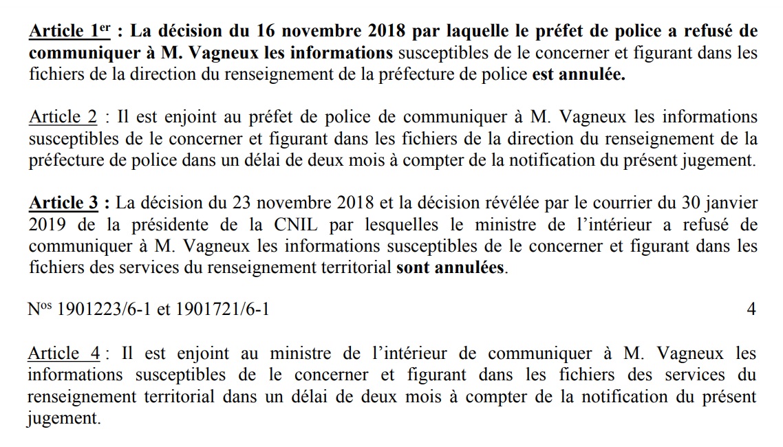 Sauf que le Tribunal ne l’a pas fait, et a annulé les décisions des préfet de police de Paris et ministre de l’Intérieur, tout en leur enjoignant de me communiquer ces informations !