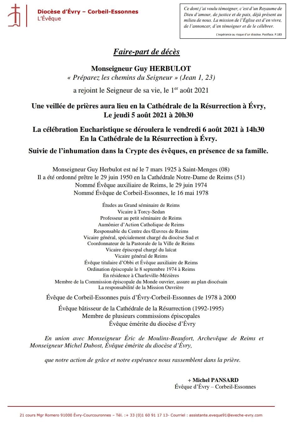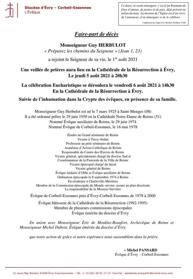 Guy HERBULOT s’en est retourné vers le Père, à l’âge de 96 ans, ce dimanche 1er août 2021 à 5 heures 10 du matin, des suites d’un cancer généralisé qui s’était tout récemment déclaré. Je voudrais lui témoigner ma gratitude pour tout ce qu’il a fait pour l’Église essonnienne, en tant qu’évêque d’Évry de 1978 à 2000, et pour l’Église universelle.
