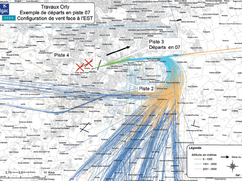 À cause de travaux de mise aux normes européennes de sécurité et de rénovation du taxiway (chemin de roulement pour déplacer les avions entre leur lieu de stationnement et les pistes) W42 jouxtant la piste 4 toute cette semaine du 9 au 13 août 2021, Orly va déporter tous ses vols sur la piste 3, et exceptionnellement sur la piste 2, depuis laquelle décollages et atterrissages passent au dessus de Savigny.