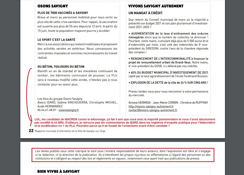 Avez-vous remarqué cette nouvelle mention, depuis l’édition de mai 2021, dans la rubrique « Expression libre » des magazines municipaux de Savigny-sur-Orge ?