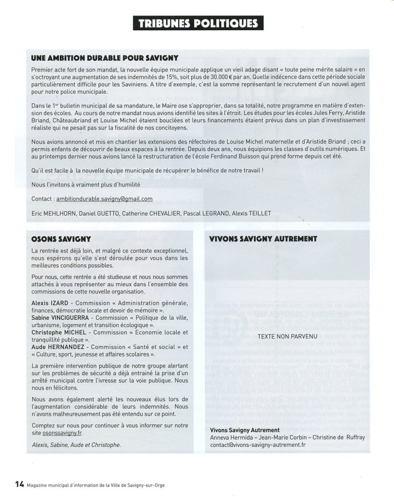 « Deux pages consécutives sont réservées à la publication de ces textes. Les pages de gauche et de droite sont alternativement attribuées aux élus de la majorité et de l’opposition. »