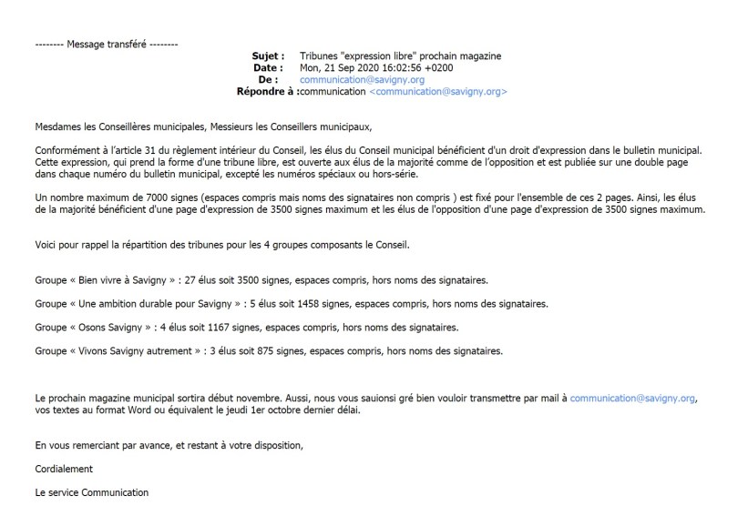 Relisez plutôt ce message du 21 septembre 2020, et faites-moi sinon la preuve qu’il a été proposé aux élus de l’opposition de s’entendre, de s’organiser autrement qu’en groupe, aussi bien avant qu’après l’adoption du règlement intérieur. Vous ne le pourrez pas.