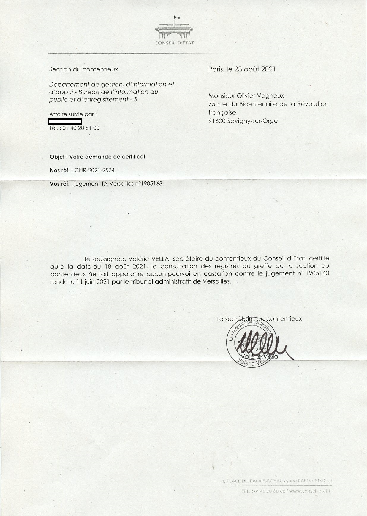 Or, si DUROVRAY a contesté le premier jugement par un pourvoi en cassation, assorti d’une requête aux fins de sursis à exécution, il n’a rien fait pour le deuxième, selon le certificat de non-pourvoi que m’a communiqué le Conseil d’État.