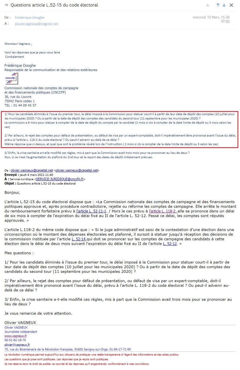 J’ai obtenu, en service Presse, des réponses de la Commission des comptes de campagne (CNCCFP) qui admet par voie de conséquence que sa saisine était tardive (en fait, Bernard a bien repris mon moyen).