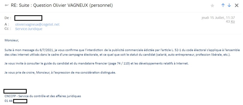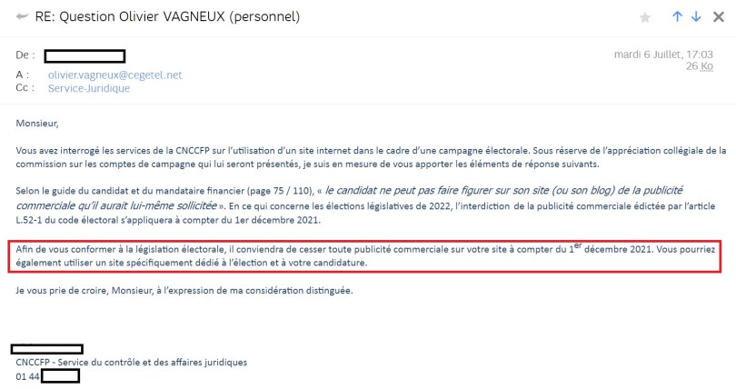 Aux fins de me conformer à la législation électorale, la Commission nationale des comptes de campagne et des financements politiques (CNCCFP) me demande de cesser toute publicité commerciale sur le présent site à compter de la date qui rend nécessaire la nouvelle élection à laquelle je suis candidat.