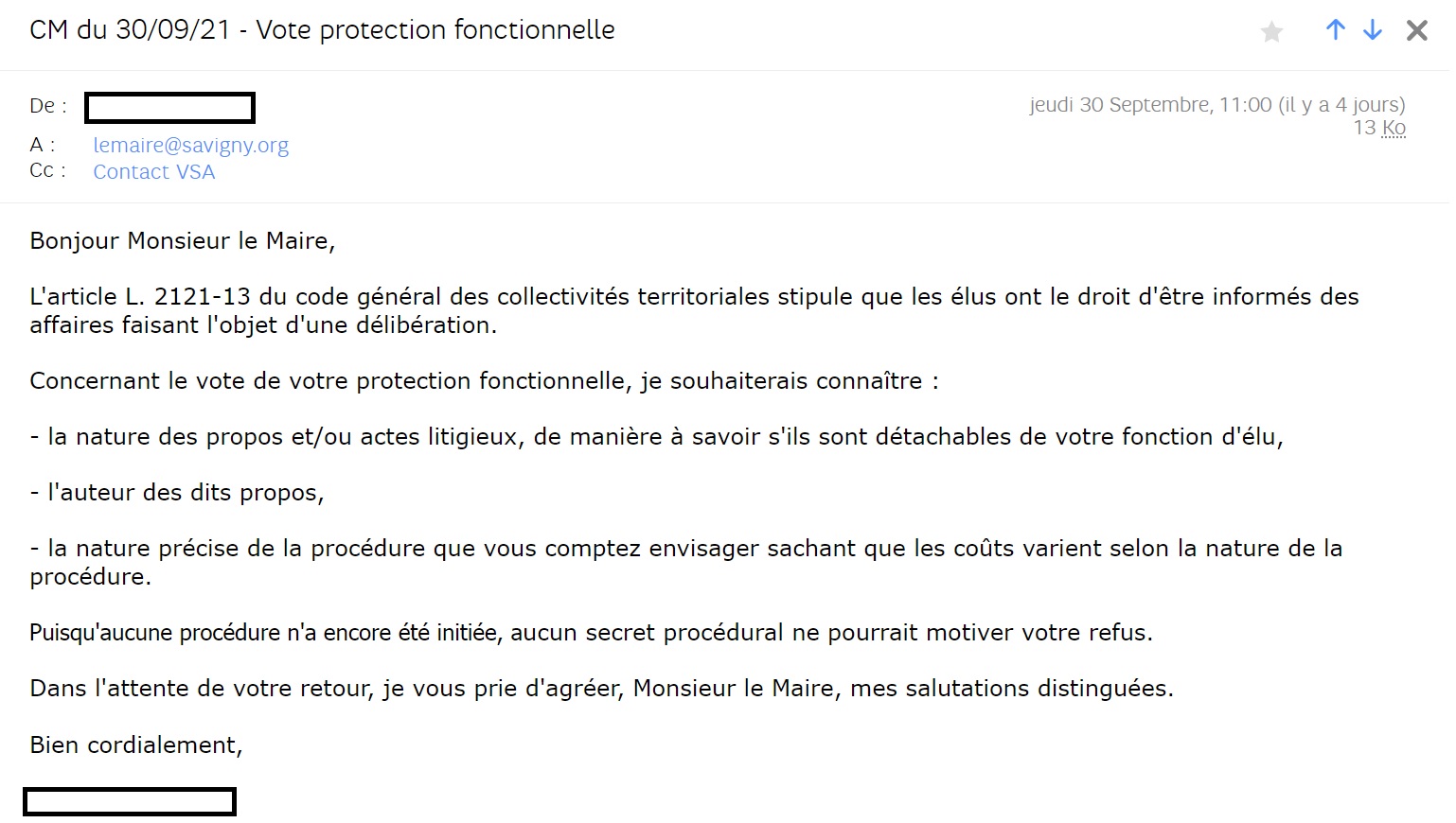 Avec le soutien de mes 3 élus, qui ont chacun demandé des informations sur la protection fonctionnelle (l’auteur des propos, la nature des propos, la procédure envisagée…),
