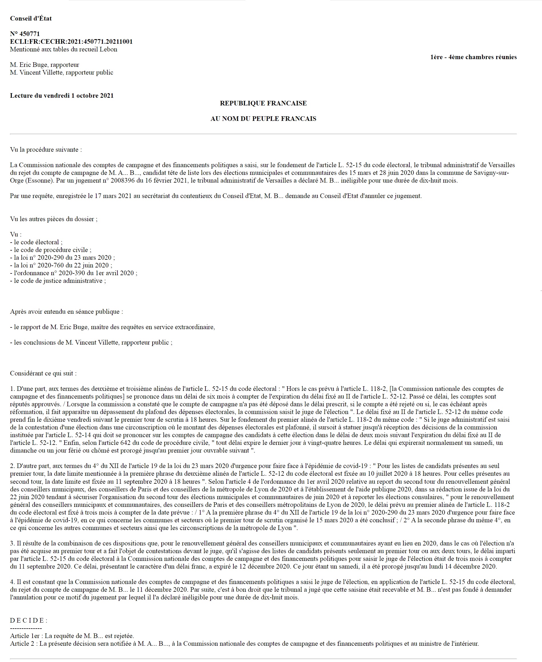 Décision éminemment contestable car la prolongation du délai prévu à l’article L. 118-2 du code électoral, prévue par la loi d’urgence sanitaire, n’implique pas la prolongation automatique du délai prévu à l’article L. 52-15 du même code, qui est pourtant le seul directement en cause dans l’affaire…
