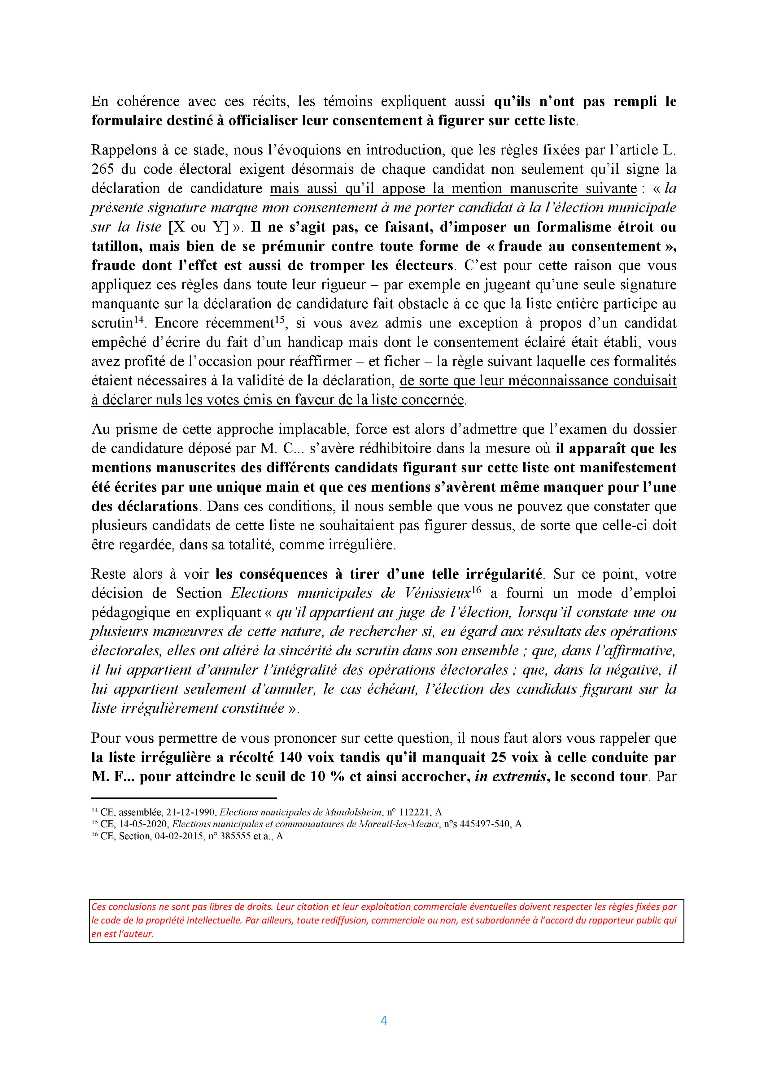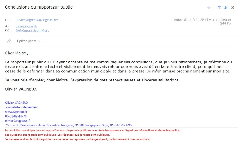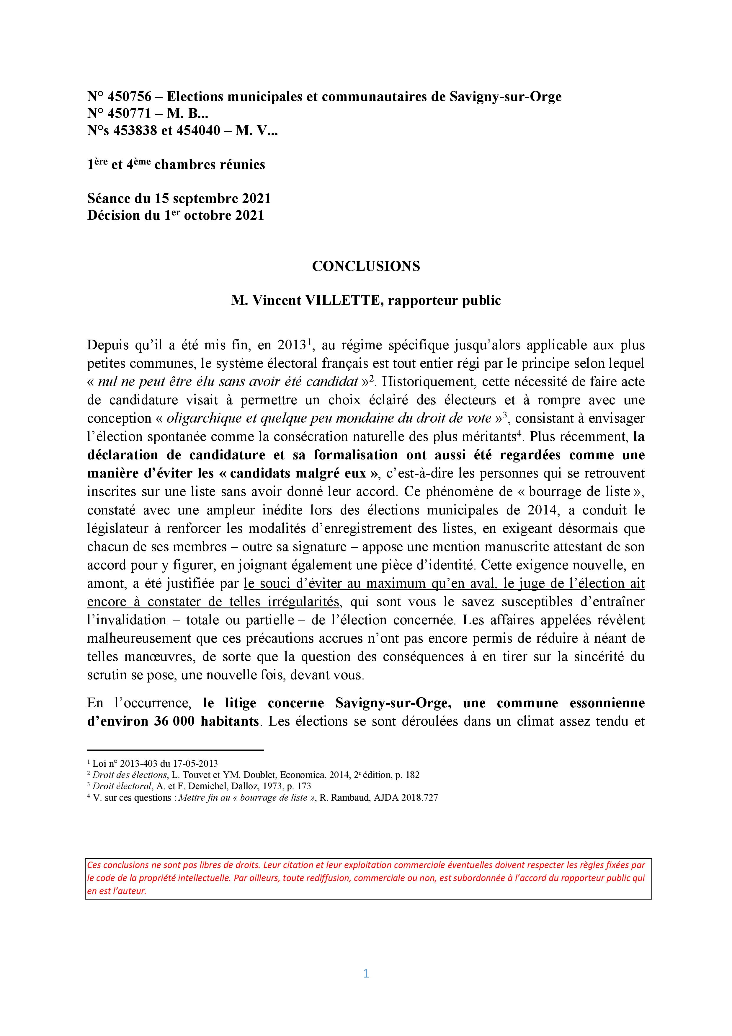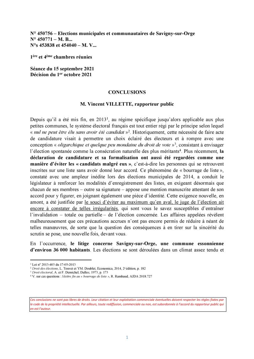 Au préalable, je veux commencer par remercier M. Vincent VILLETTE, rapporteur public au Conseil d’État, qui a accepté de me communiquer GRATUITEMENT (la pratique, réglementée par arrêté, veut pourtant qu’on paie 7 euros), puis m’a autorisé à rediffuser le texte de ses conclusions prononcées lors de l’audience publique à l’issue de laquelle a été décidée l’annulation de l’élection municipale 2020 de Savigny-sur-Orge.