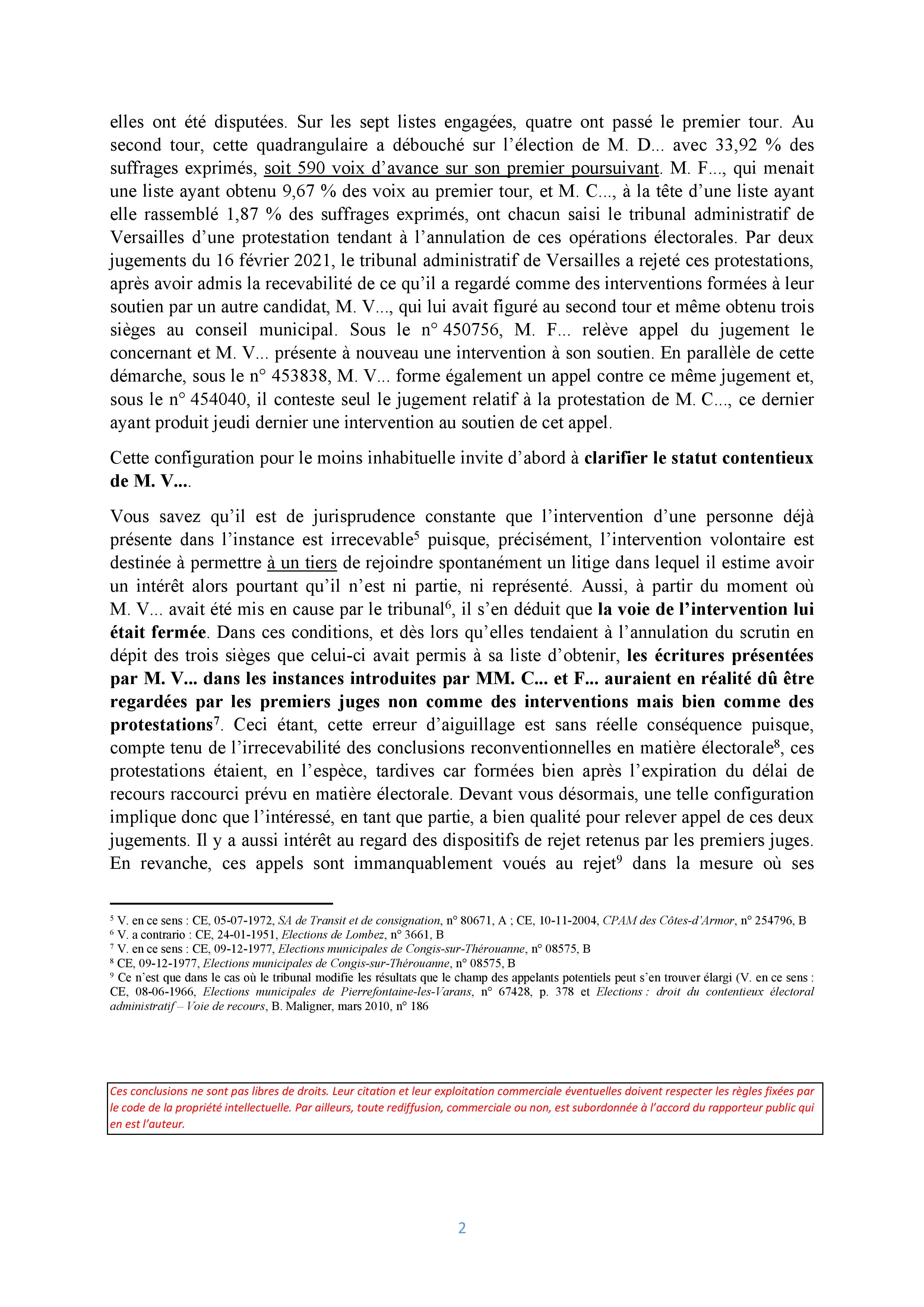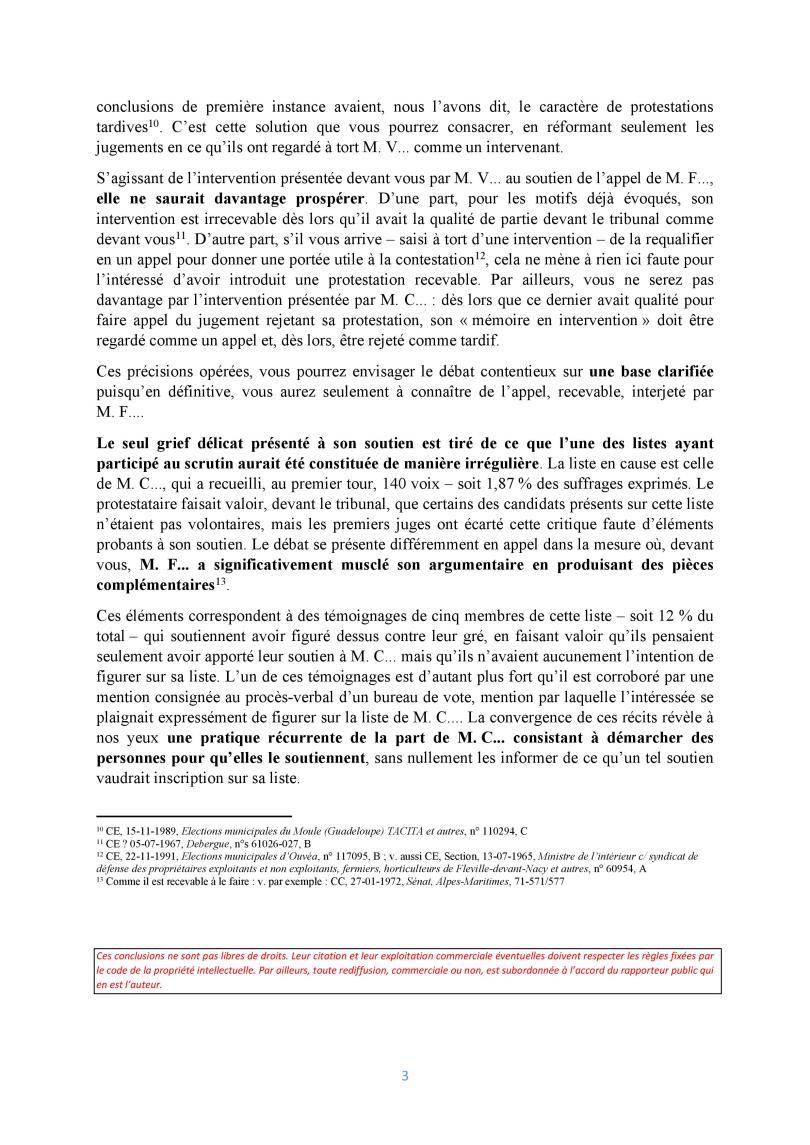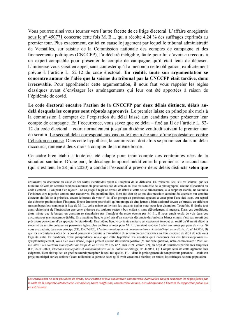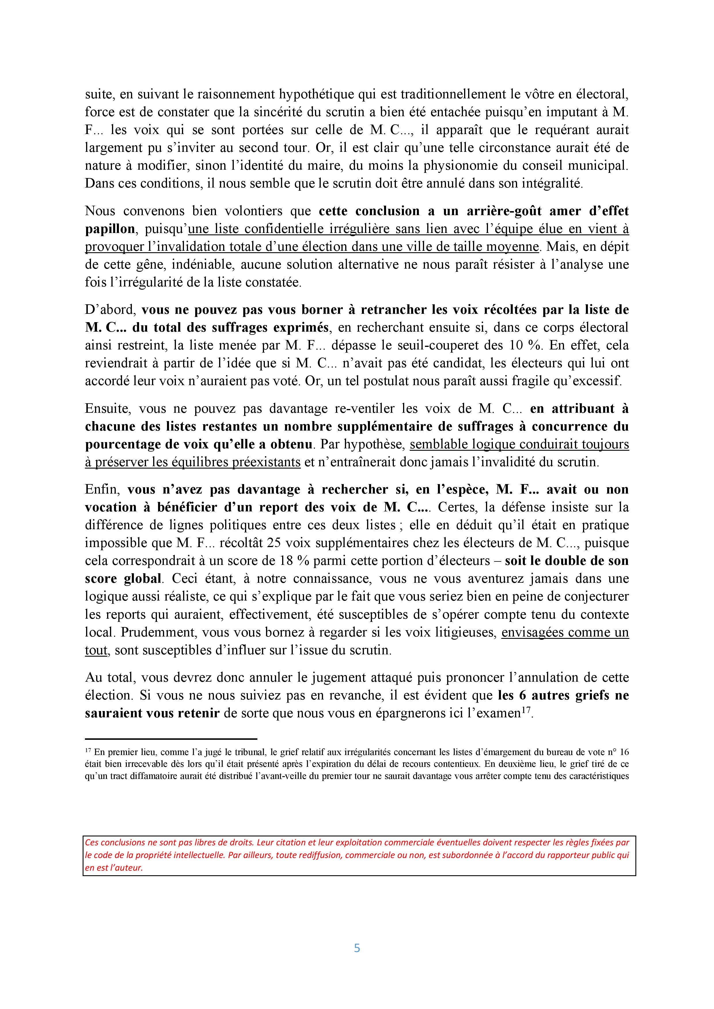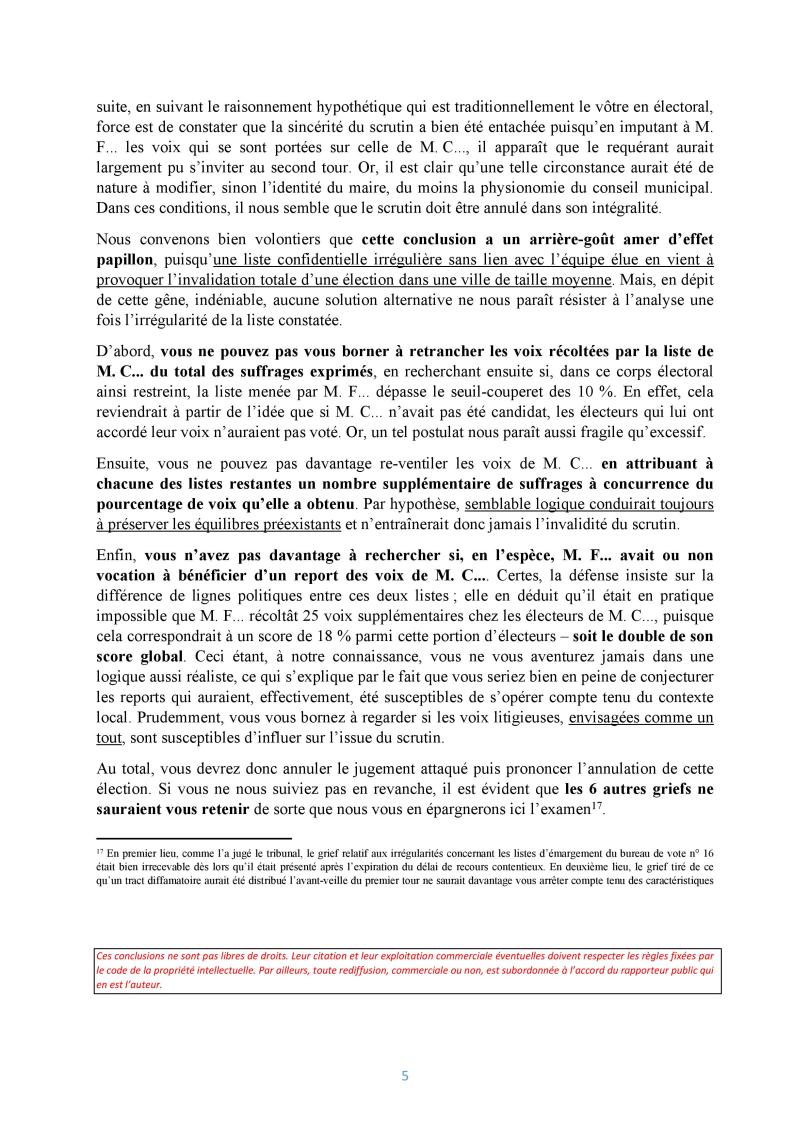« Nous convenons bien volontiers que cette conclusion a un arrière-goût amer d’effet papillon, puisqu’une liste confidentielle irrégulière sans lien avec l’équipe élue en vient à provoquer l’invalidation totale d’une élection dans une ville de taille moyenne. Mais, en dépit de cette gêne, indéniable, aucune solution alternative ne nous paraît résister à l’analyse une fois l’irrégularité de la liste constatée. » (conclusions de Vincent VILLETTE, 1ère et 4e chambres réunies, 450756, Élection municipale de Savigny-sur-Orge)