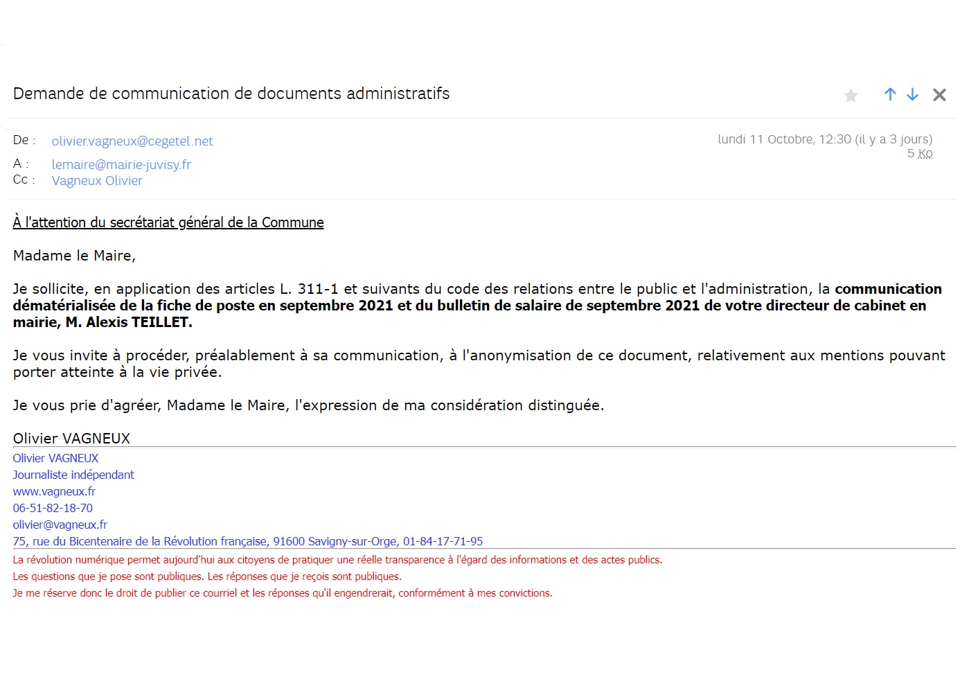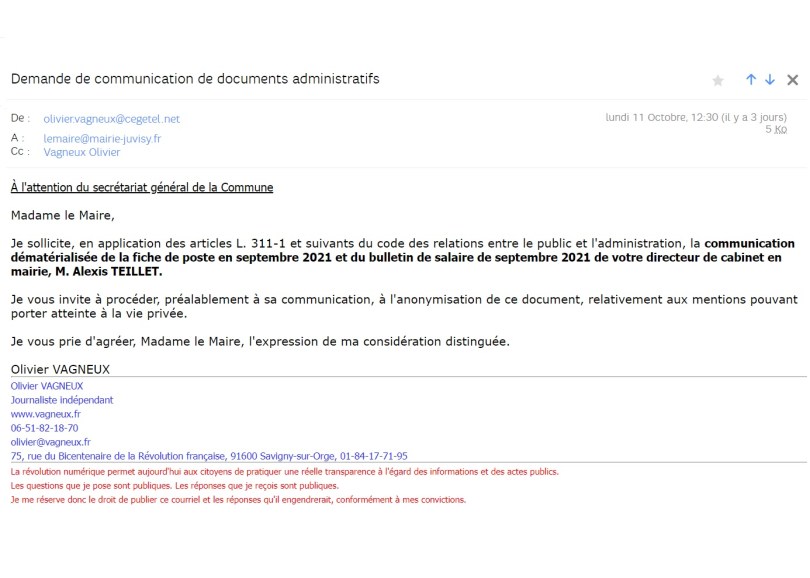 Obtiendrais-je la fiche de poste et le bulletin de salaire d’Alexis TEILLET, directeur de cabinet de la maire de Juvisy-sur-Orge ?