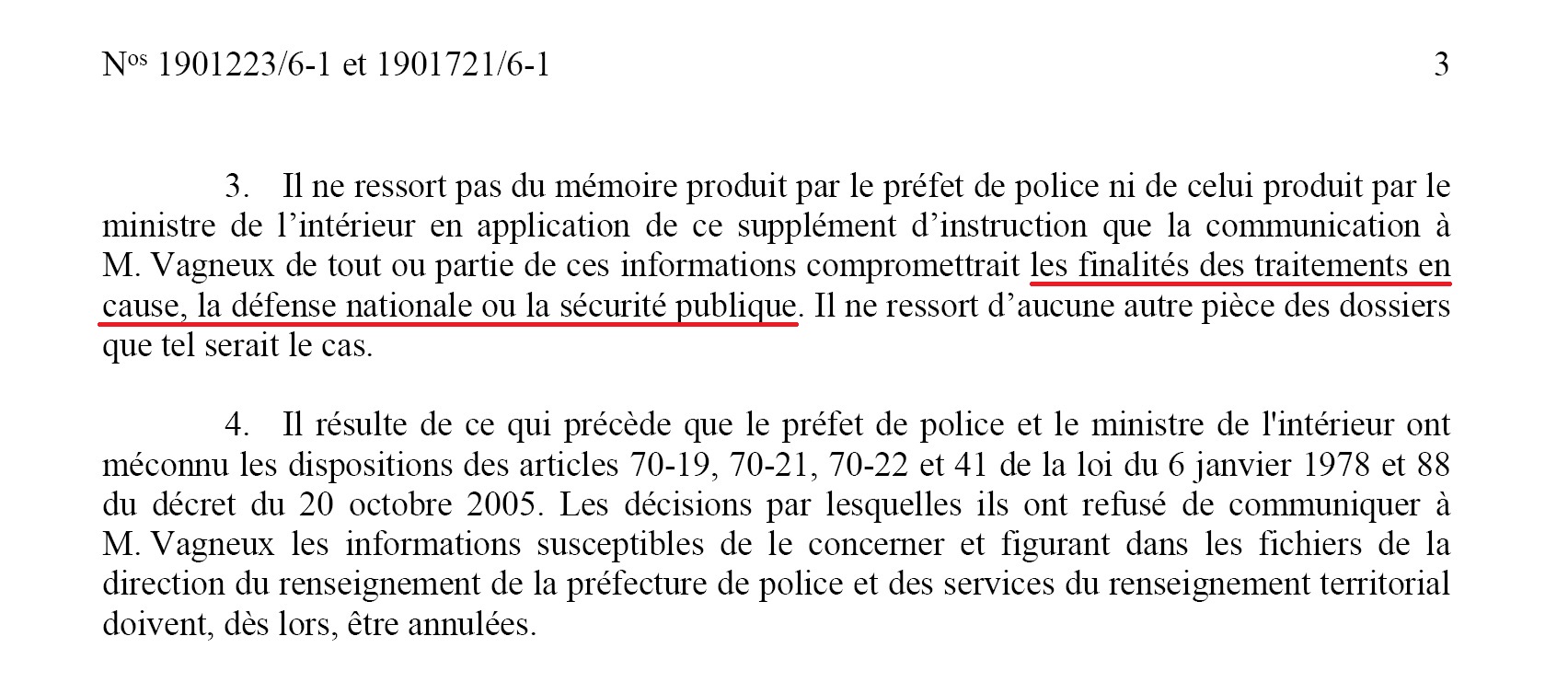 Or, je lis dans mon jugement du Tribunal administratif de Paris, relativement aux objectifs (ou finalités) des fichiers dans lesquelles je demandais à savoir si j’apparaissais dedans :