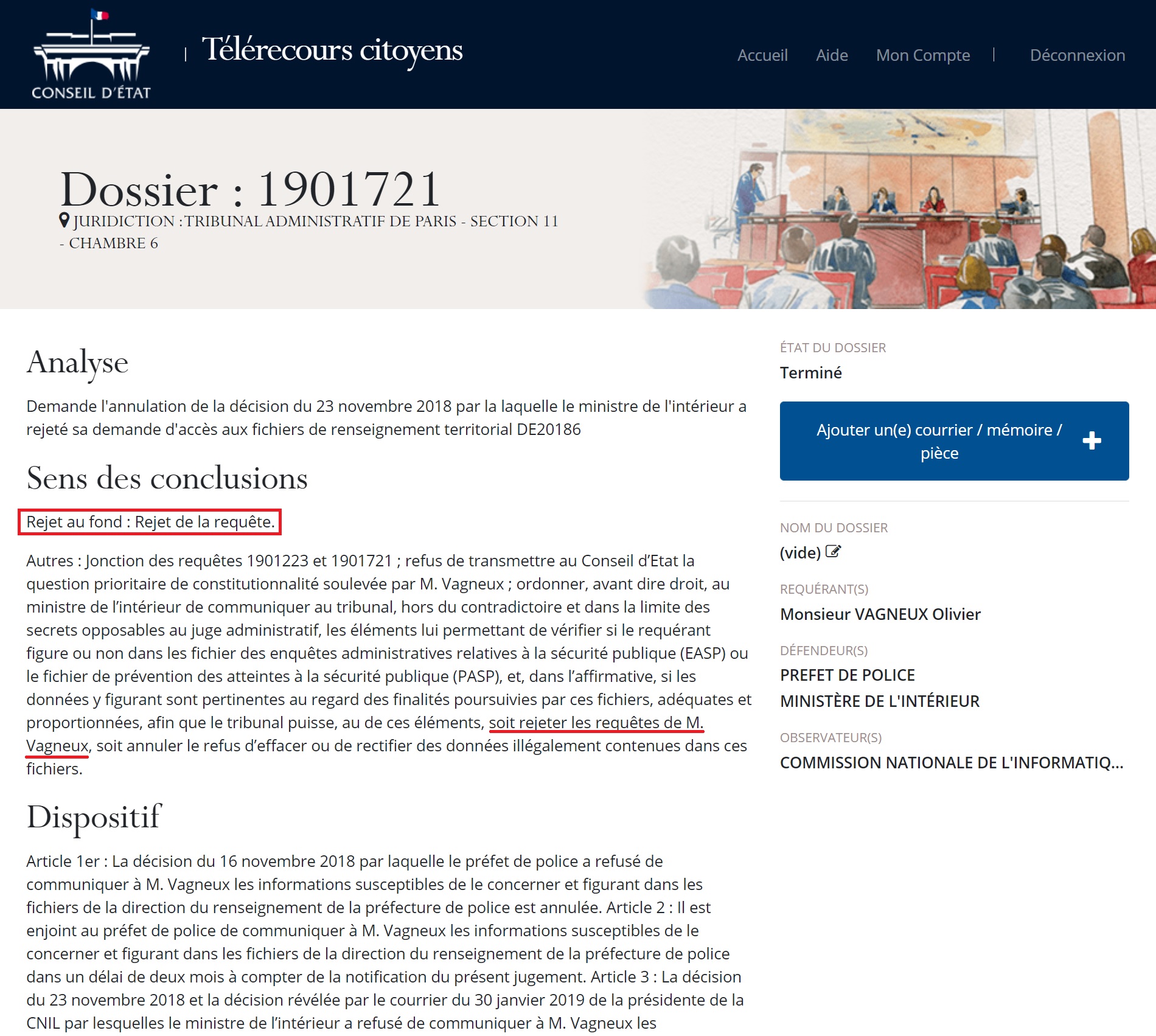 Sauf que la rapporteure publique du Tribunal administratif de Paris, d’une chambre qui est spécialisée dans ce type de contentieux, a cité cette jurisprudence dans ses conclusions, dans lesquelles elle n’a jamais entrevue autre chose que le rejet de ma requête, ou à défaut, une action du Tribunal pour que lui-même intervienne pour faire annuler ou rectifier lesdites données.