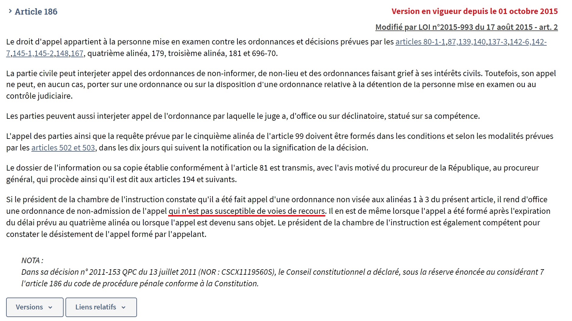 L’article 186 alinéa 6 du code de procédure pénale dit que les ordonnances de la présidente de la chambre de l’instruction sont insusceptibles de recours. Donc c’était normalement fini pour moi…