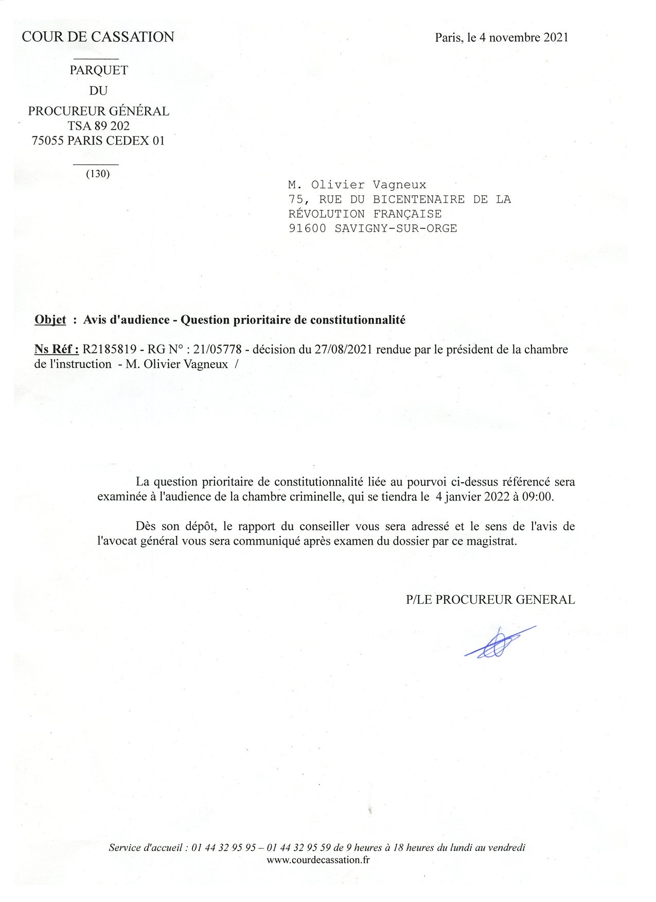Sans donc présumer de ce qui va se passer par la suite, je me réjouis de cette progression en droit (qui n’a absolument rien à voir avec mes études car je n’ai pas fait de droit pénal ni de droit constitutionnel en L3), qui me permet de voir aujourd’hui une de mes QPC examinée par la Cour de cassation !
