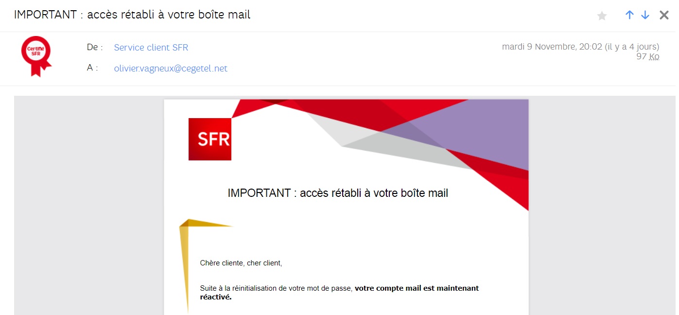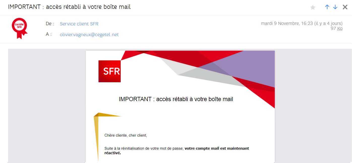 La dernière fois que cela m’est arrivé, c’est-à-dire que SFR a bloqué ma messagerie par sécurité parce qu’un tiers tentait d’en forcer l’accès, c’était pile au moment où j’avais obtenu d’une juge d’instruction la convocation d’un des amis PS de Jean-Marc DEFRÉMONT relativement à l’histoire de ce corbeau qui me harcèle depuis bientôt deux ans…