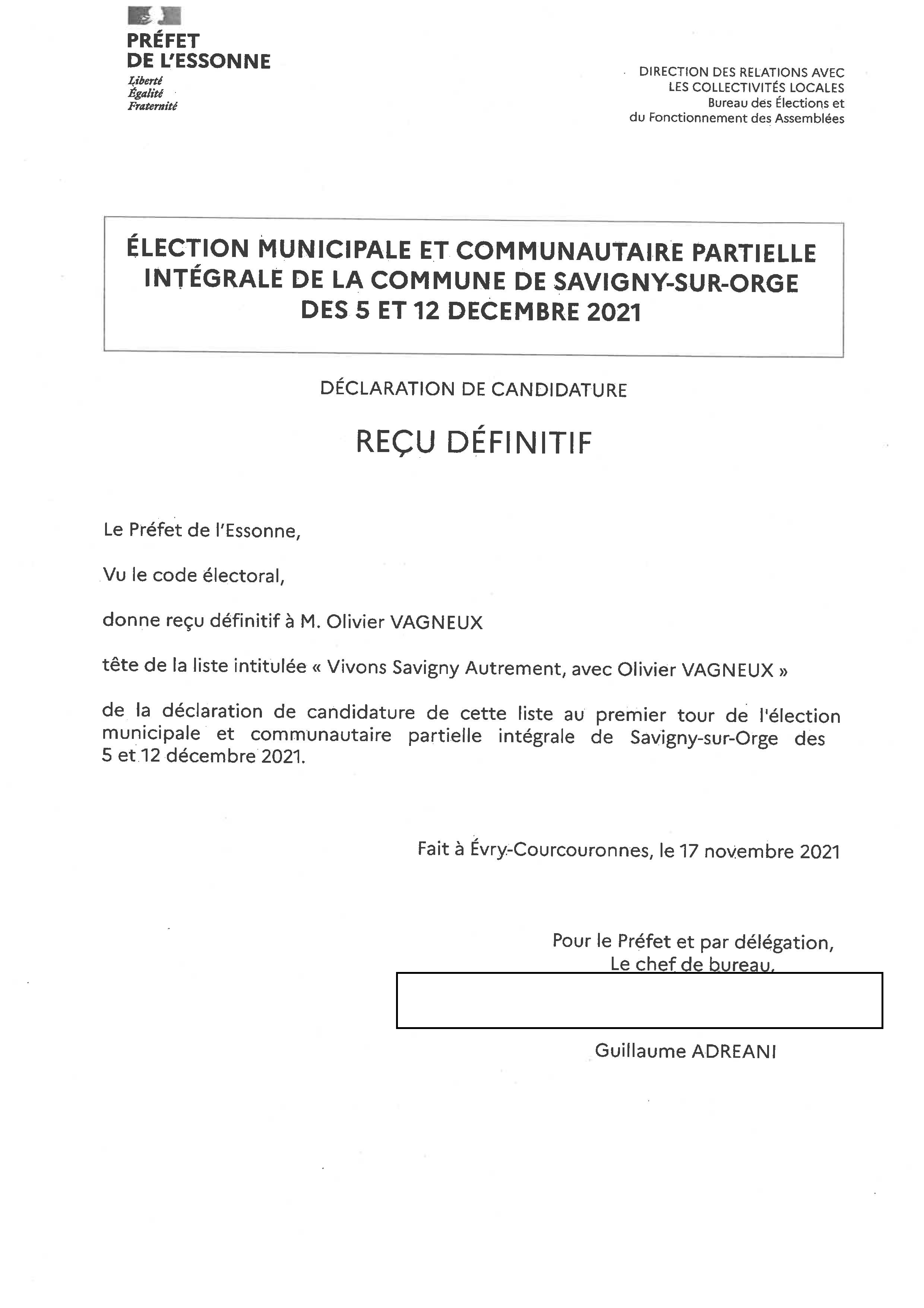 C’est avec une grande satisfaction que nous vous annonçons très officiellement notre candidature à l’élection municipale 2021 de Savigny-sur-Orge, après réception du reçu définitif de la préfecture !