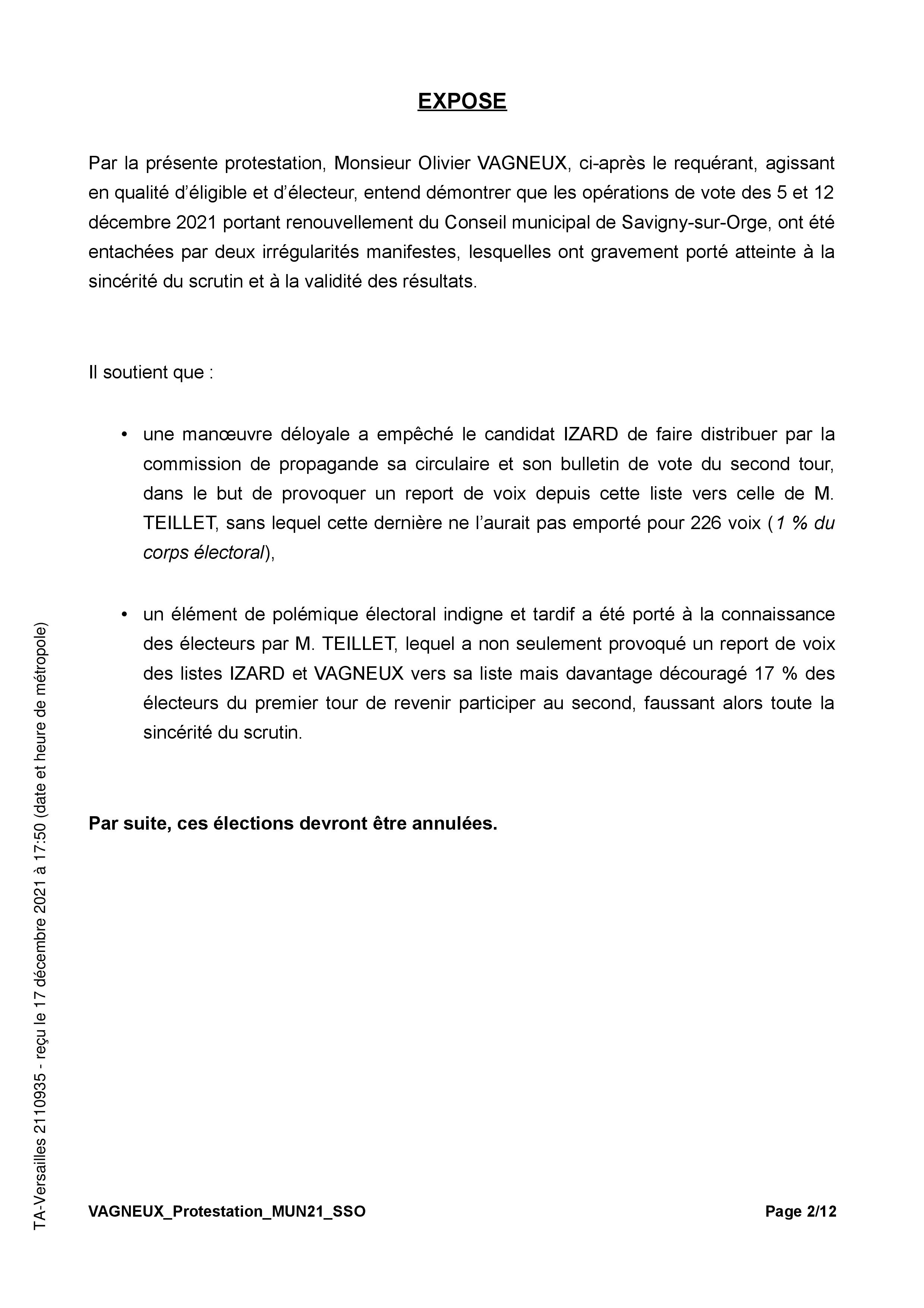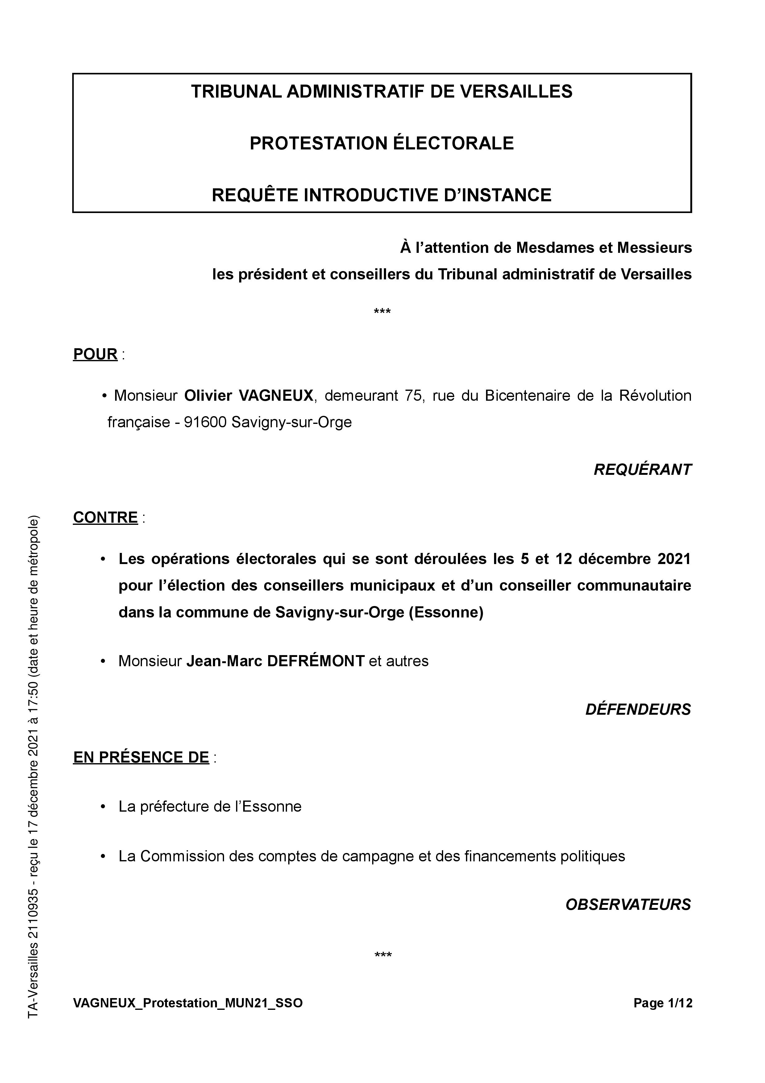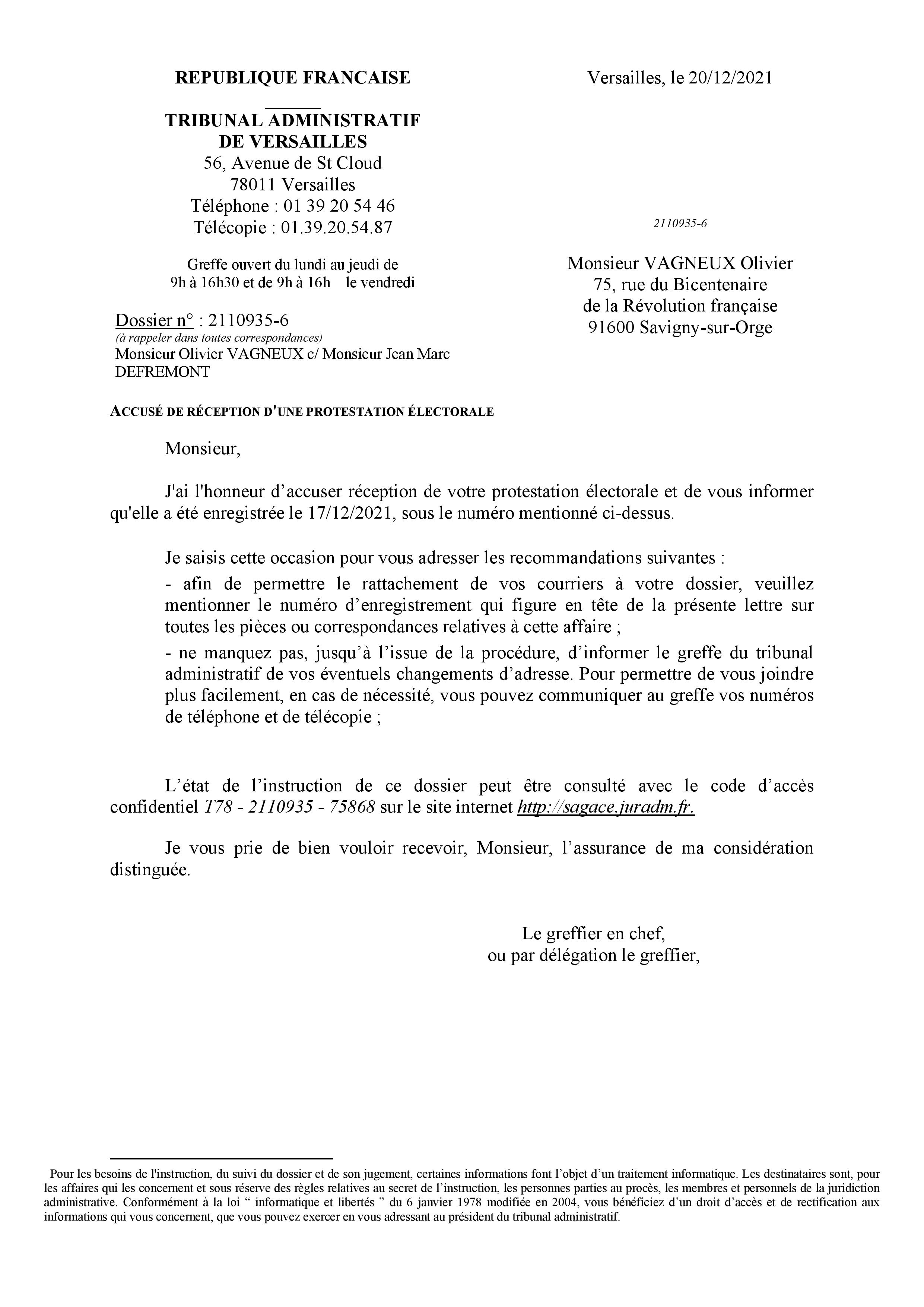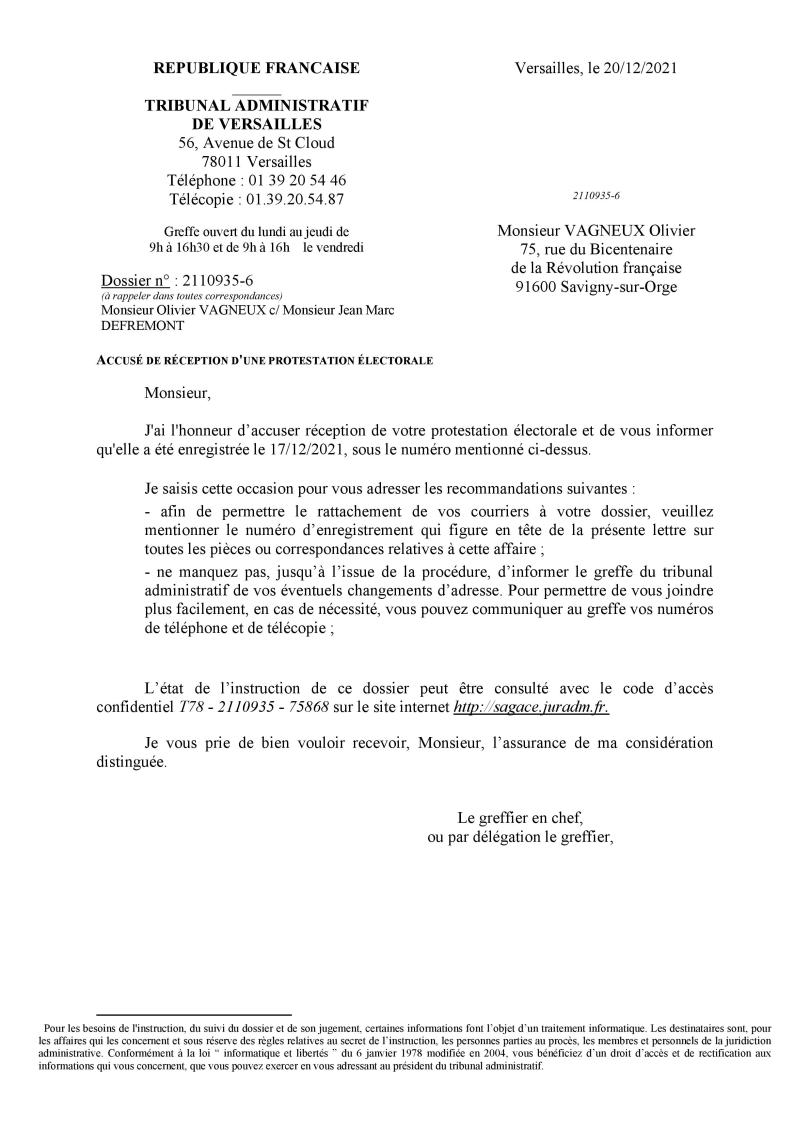 Cette protestation a été enregistrée sous la référence d’instance 2110935 par le Tribunal administratif de Versailles. Elle a été confiée à l’instruction de la 6e chambre du Tribunal, laquelle avait déjà examiné puis rejeté les protestations électorales de MM. FABRE et CURATOLO pour l’élection de 2020.