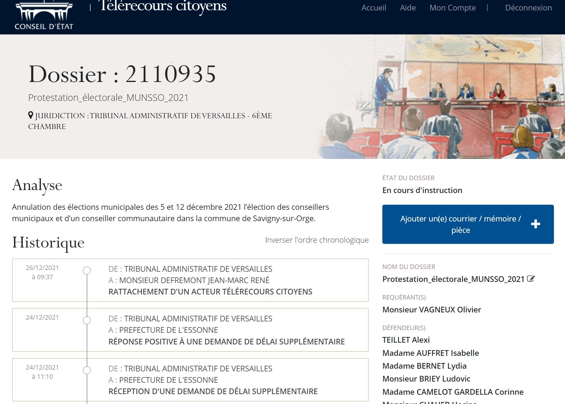 À défaut d’un déféré préfectoral, qui peut encore légalement être déposé d’ici à mardi (nous ne le connaîtrons alors qu’en fin de semaine), force est de constater que le préfet de l’Essonne a demandé, vendredi 24 décembre, un délai supplémentaire pour répondre à ma protestation.
