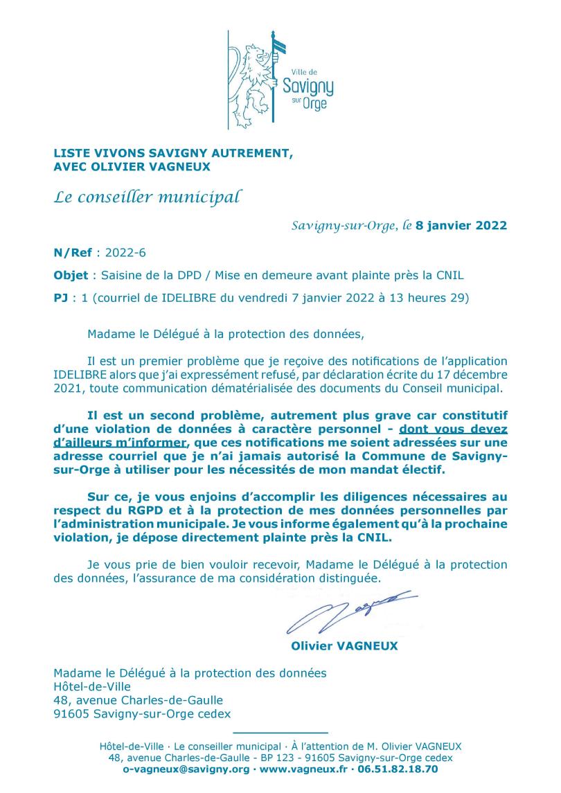 Notre mise en demeure de la déléguée à la protection des données personnelles de la Commune de Savigny-sur-Orge