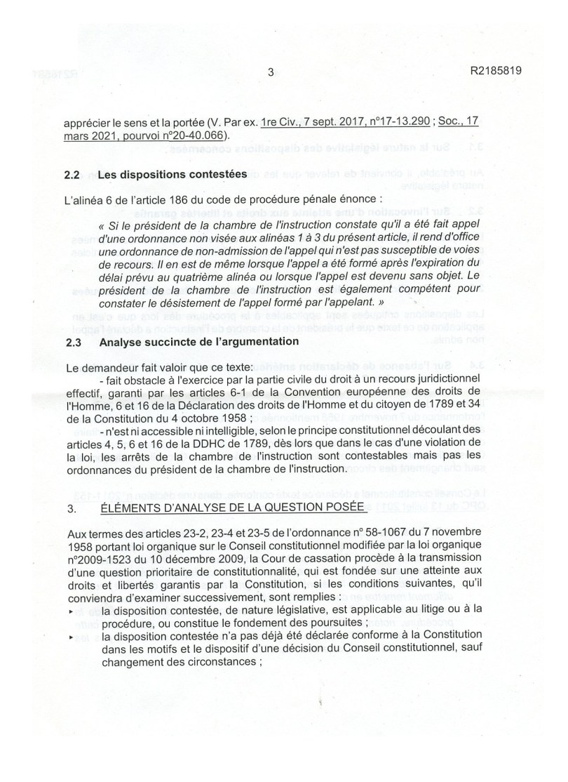 La Cour de Cassation déclare irrecevable ma question en tant qu’elle ne mentionnerait pas les droits et libertés garantis par la Constitution auxquels la disposition contestée (l’article 186 du code de procédure pénale) porterait atteinte.