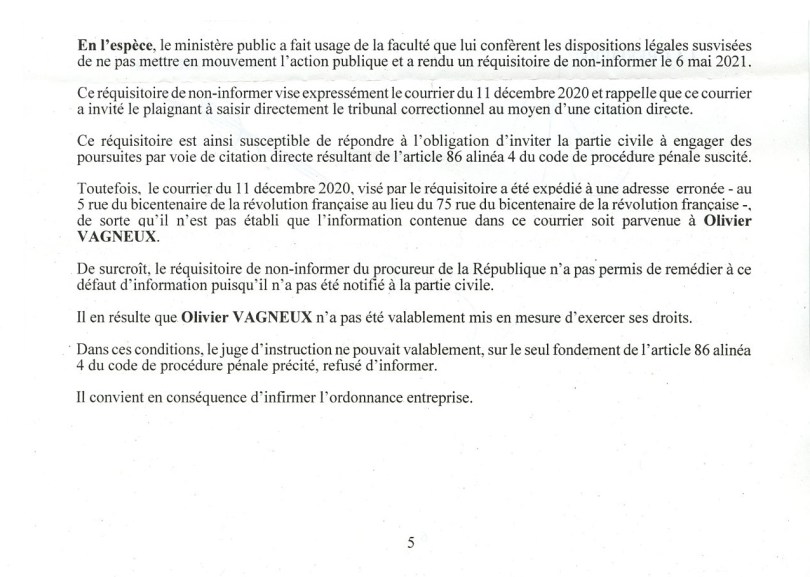 Dans ces conditions, la Cour d’appel a jugé que je n’avais pas été valablement mis en mesure d’exercer mes droits et infirmé l’ordonnance du juge d’instruction puis renvoyé l’affaire.