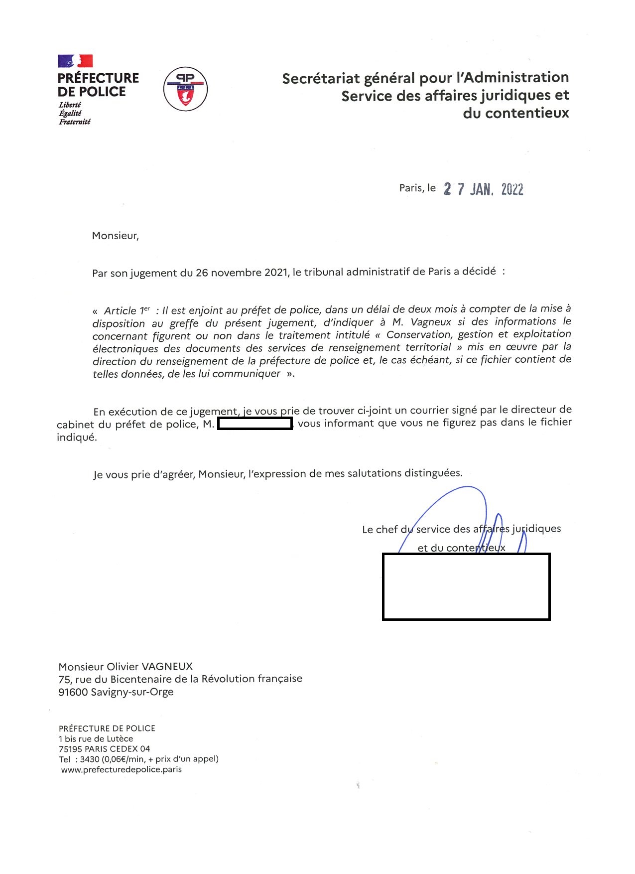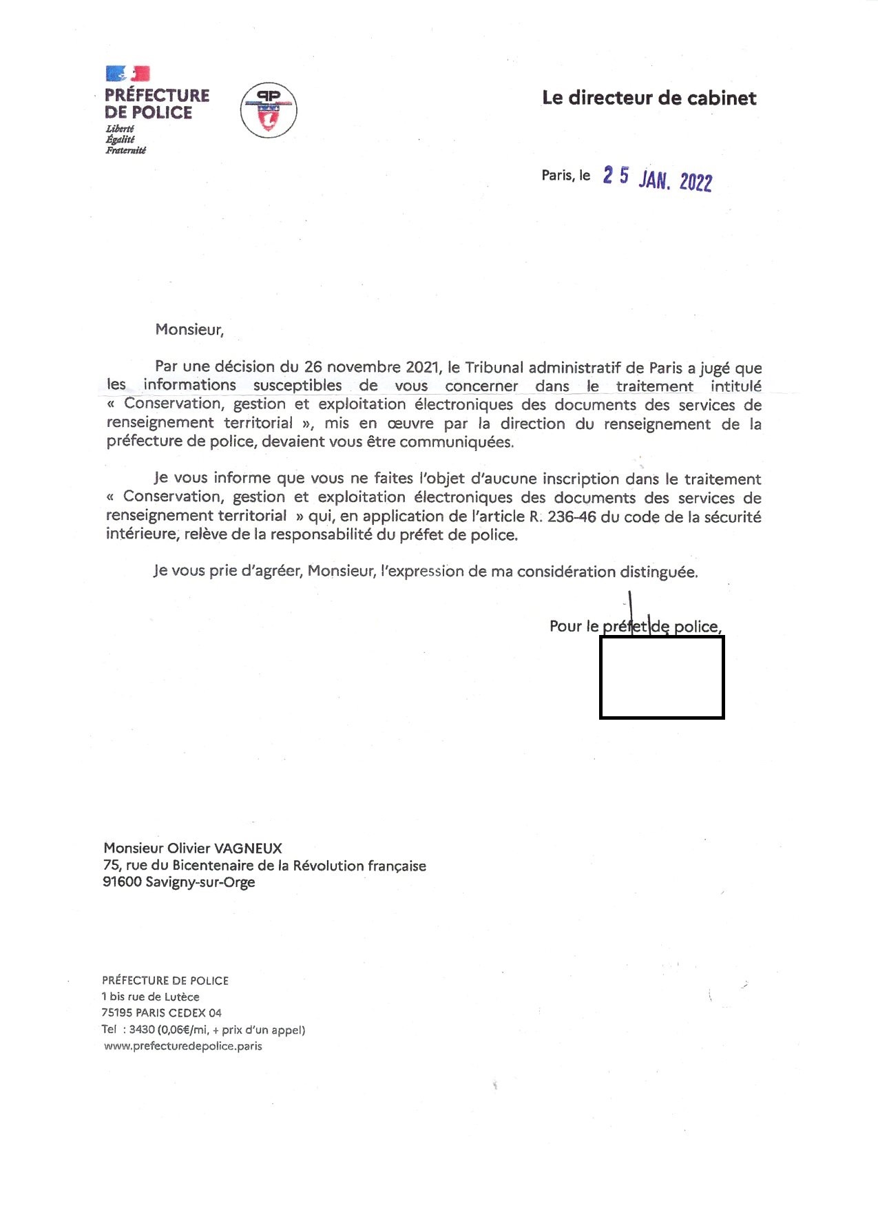 En exécution de l’injonction obtenue du Tribunal administratif de Paris le 26 novembre 2021, le préfet de police de Paris nous communique les informations susceptibles de nous concerner dans les différents traitements dont il a la responsabilité, en l’occurrence ici dans le fichier « Conservation, gestion et exploitation électroniques des documents des services de renseignement territorial ».
