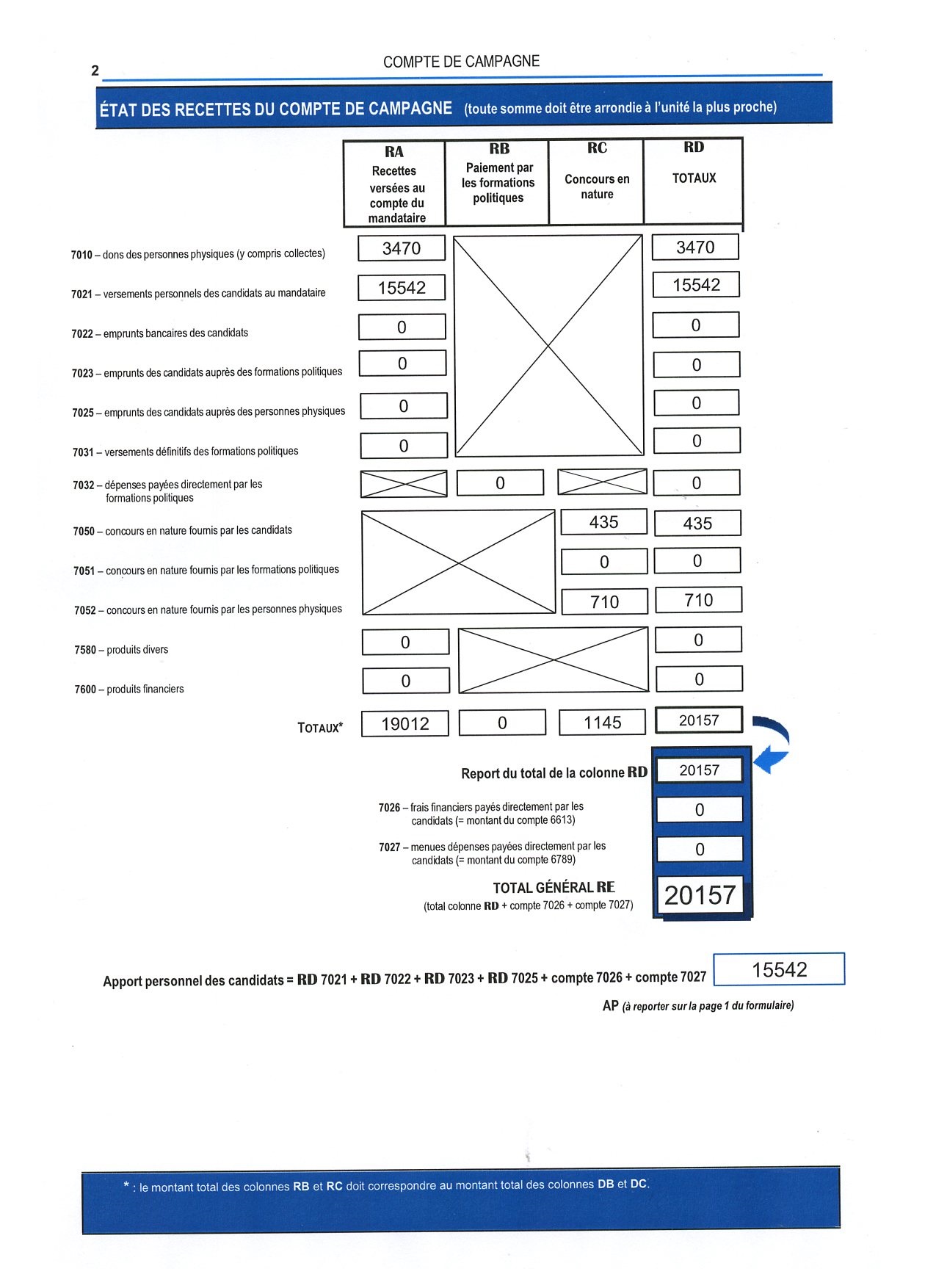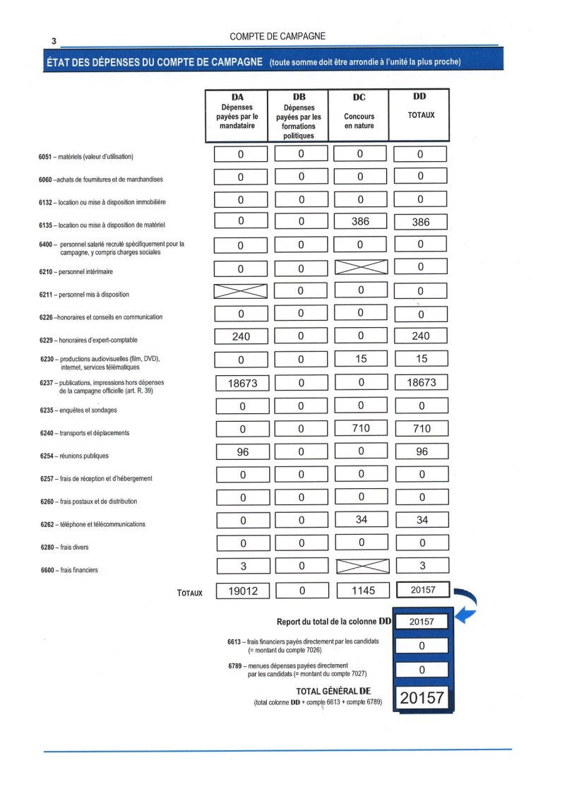 Dans le détail, sur les 20 157 euros du total, il y a eu 19 012 euros de dépenses engagés par le mandataire (Merci encore à l’ami Xavier) et 1 145 euros de concours en nature (représentant la valeur des biens que nous avions déjà et que nous avons utilisé pour la campagne).